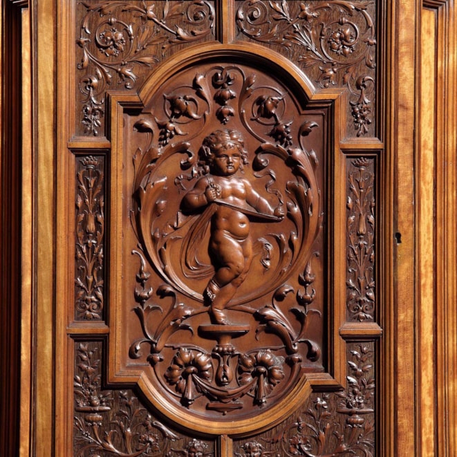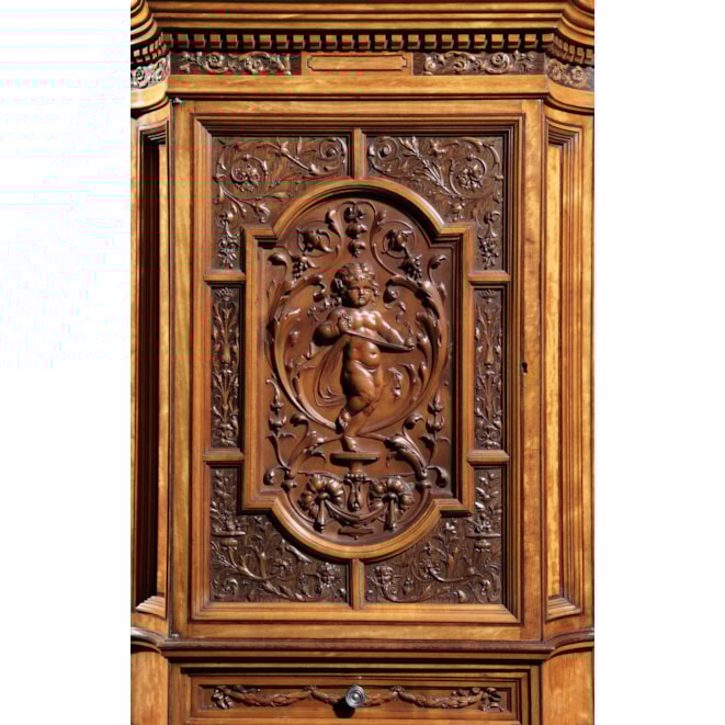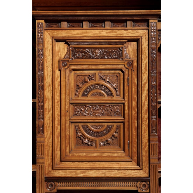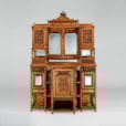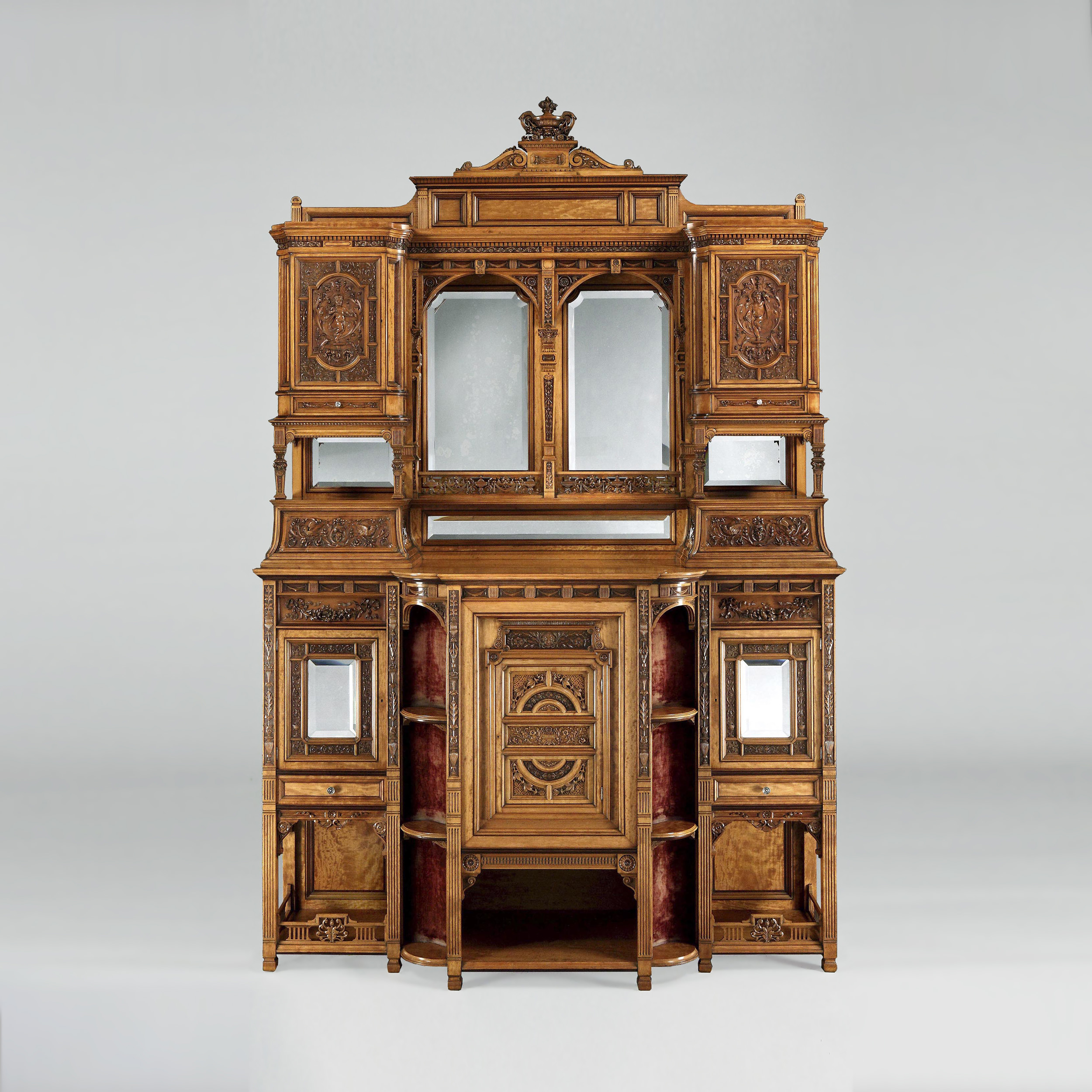 The maker has chosen to use a richly grained satinwood, and executed the carving with extraordinary fluency and precision, foliates, putti and birds are featured; over the open sectioned base, quadrant shelves flank the lower door; above, double bevelled and arched mirrors have flanking cupboards with richly carved fascias, conjoined by a running gallery, and, surmounted by a serpentine shaped cornice. Circa 1885