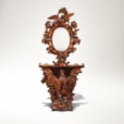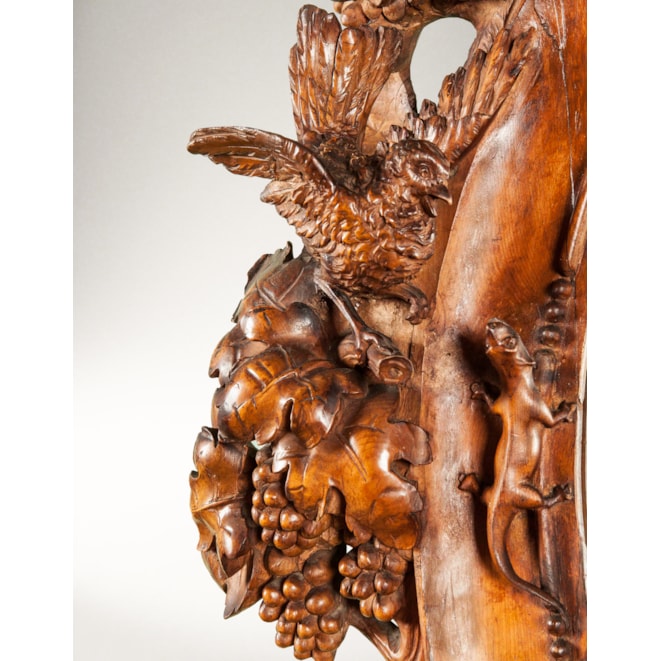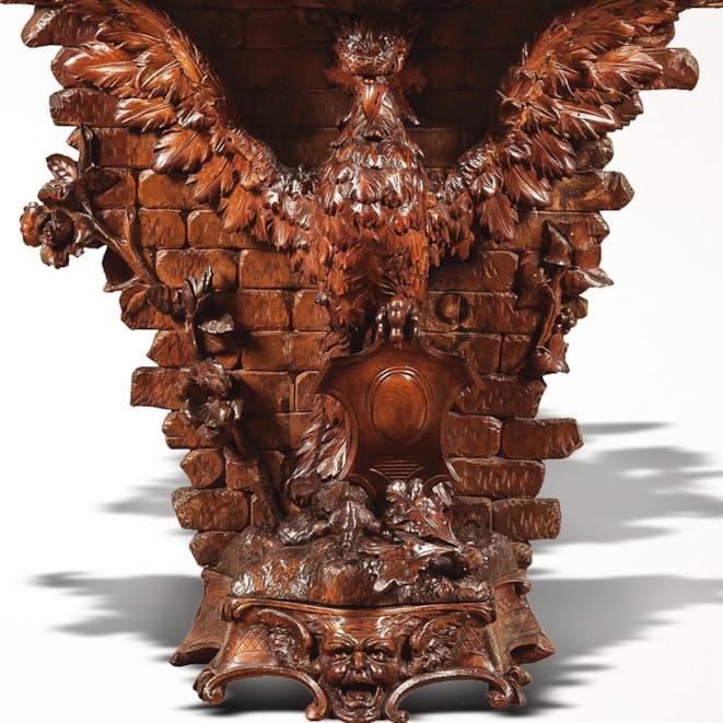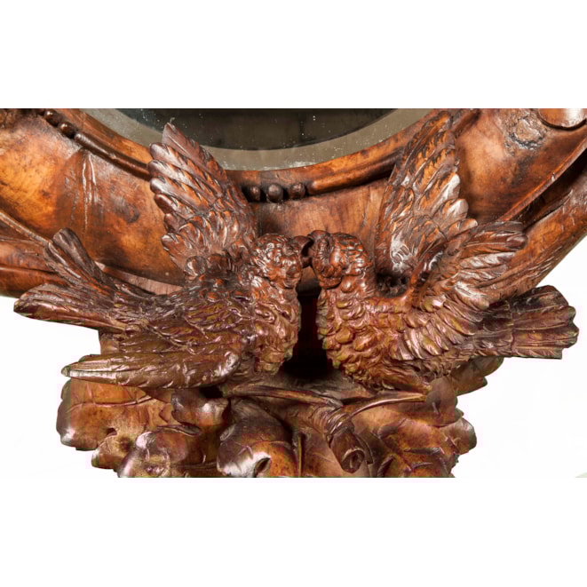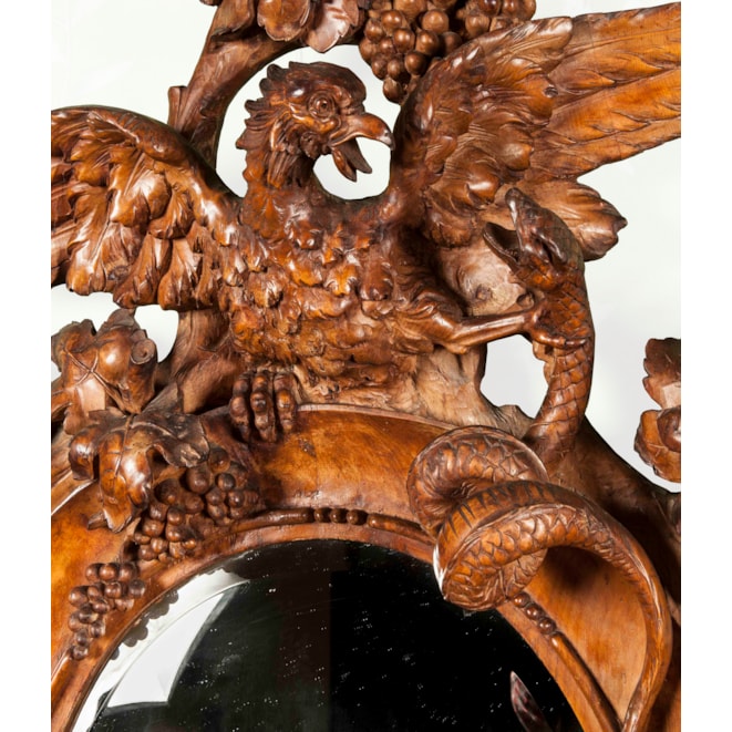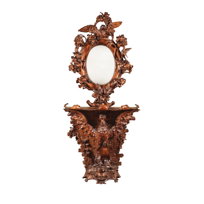 Constructed in walnut, richly and finely carved; rising from a serpentine base supported by shaped and scrolled feet, with an spread wing eagle, with one talon aloft, holding a shield shaped cartouche, over a grotesque mask, with an architectural background of a brickwork wall, adorned with tendrils and foliates; the shaped and carved platform with upturned scrolls has a complexly and finely carved mirror frame over, comprehensively adorned with foliates, vines, grapes, lovebirds, and an eagle contending with a snake atop, enclosing an elliptical bevelled mirror. Italian, Circa 1870