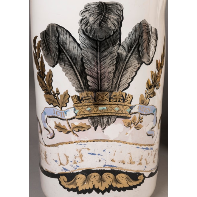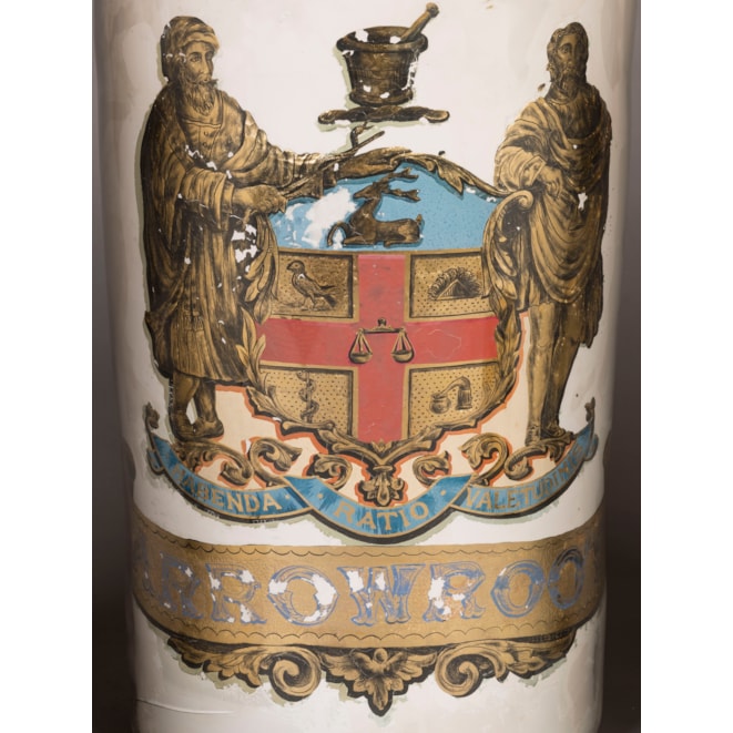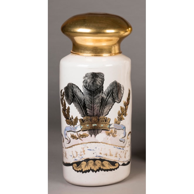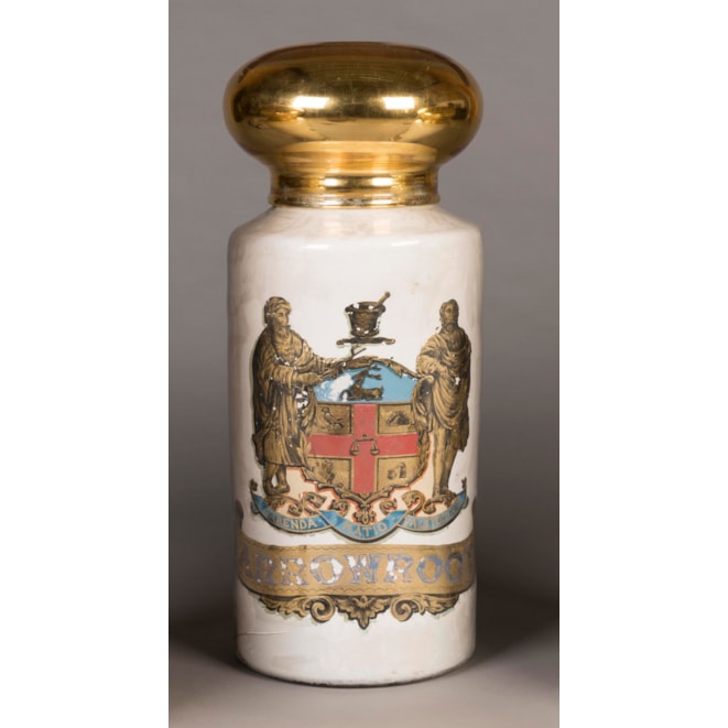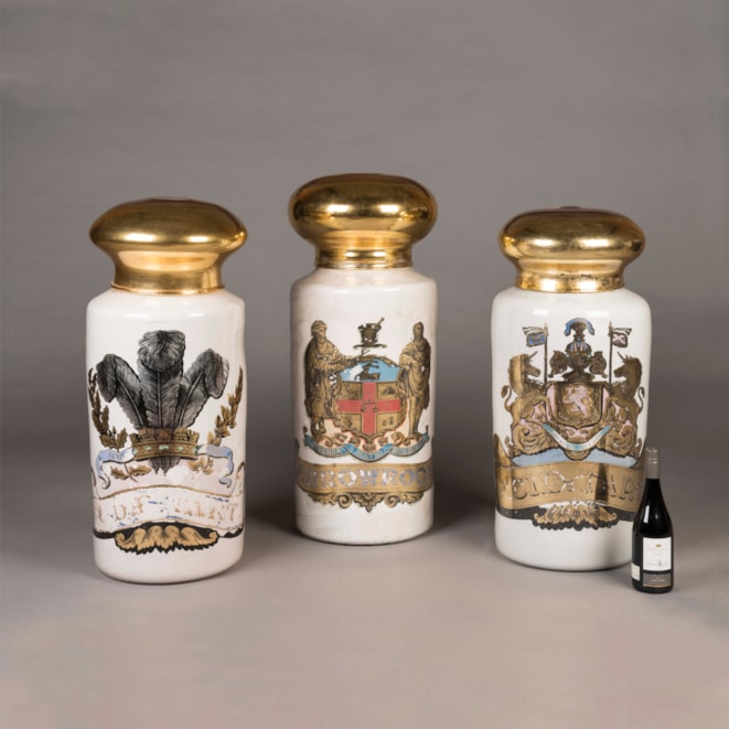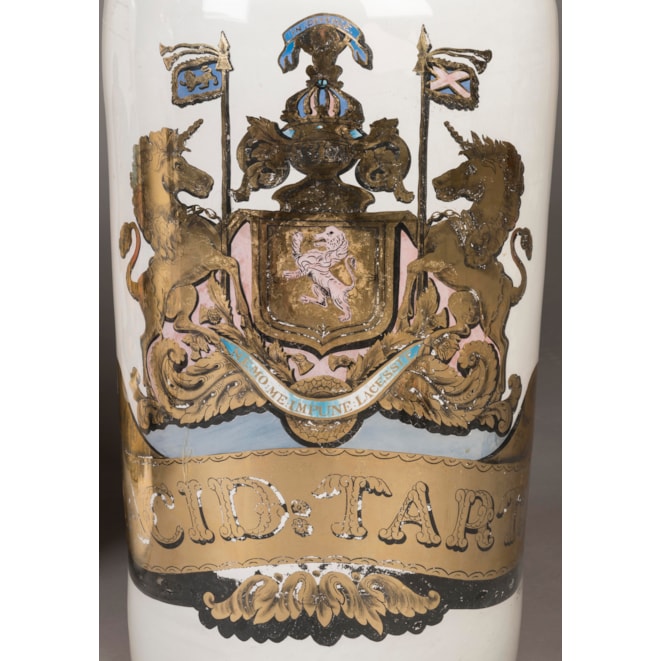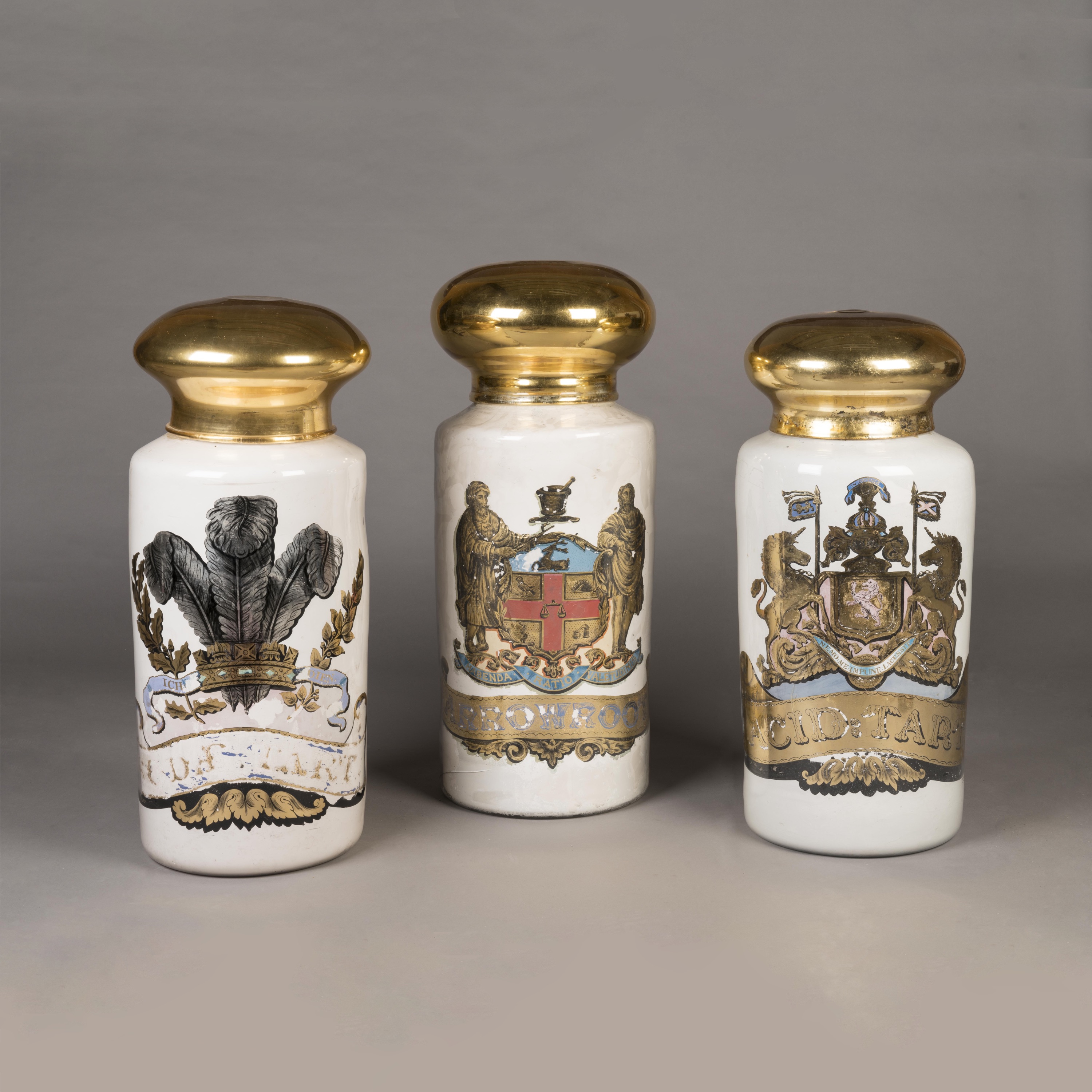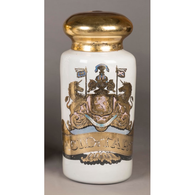 Of impressive size intended for display purposes, the glass jars entirely reverse painted by hand, each on a white ground, one labelled “Sodæ Tart” below the Prince of Wales feathers, another “Arrowroot” also bearing the coat of arms of the Royal Pharmaceutical Society, and the last marked “Acid Tart” underneath the Royal Arms of Scotland. Each jar with its original gilt domed lid.