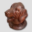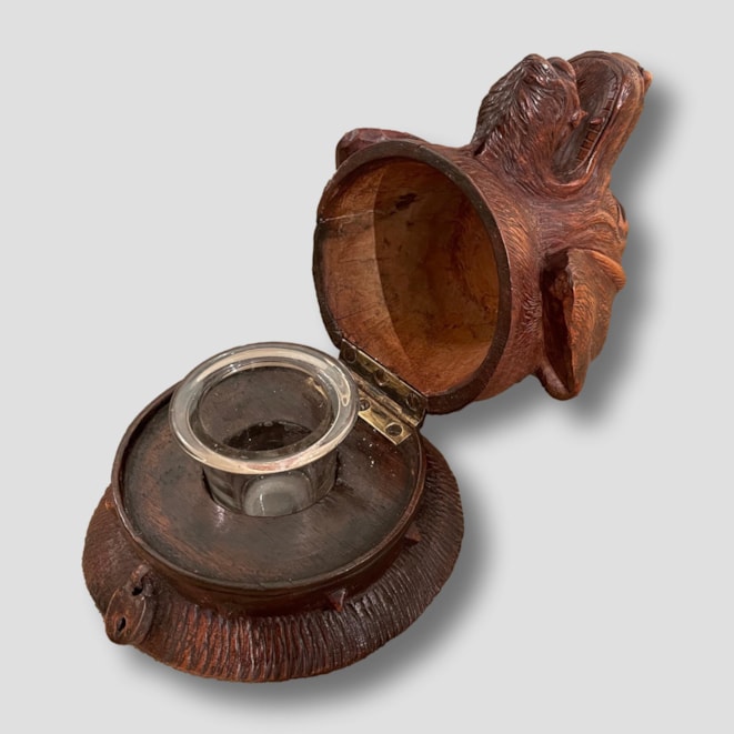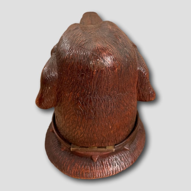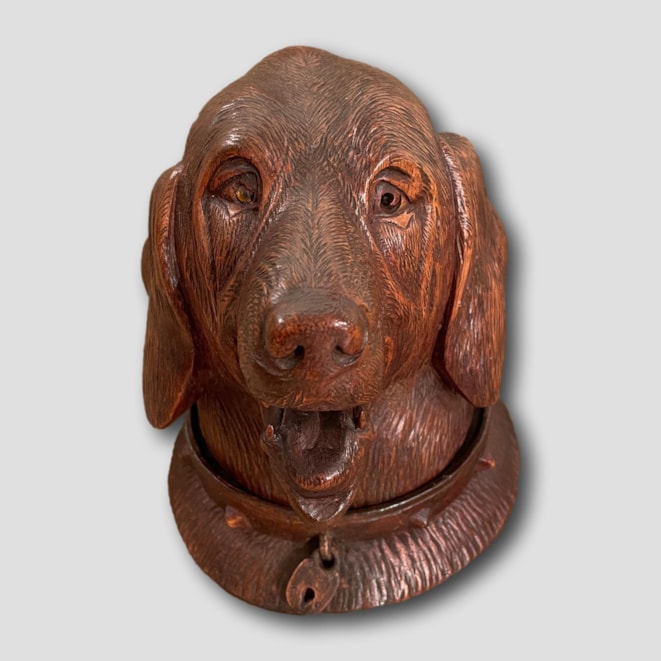 Hand-carved from native Lindenwood and gently patinated throughout, the playful dog depicted form the neck upwards with his mouth agape and heedful glass inset eyes, a hinge above his collar opening up to reveal a compartment fitted with a glass inkwell.