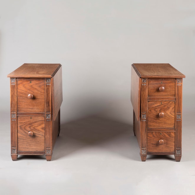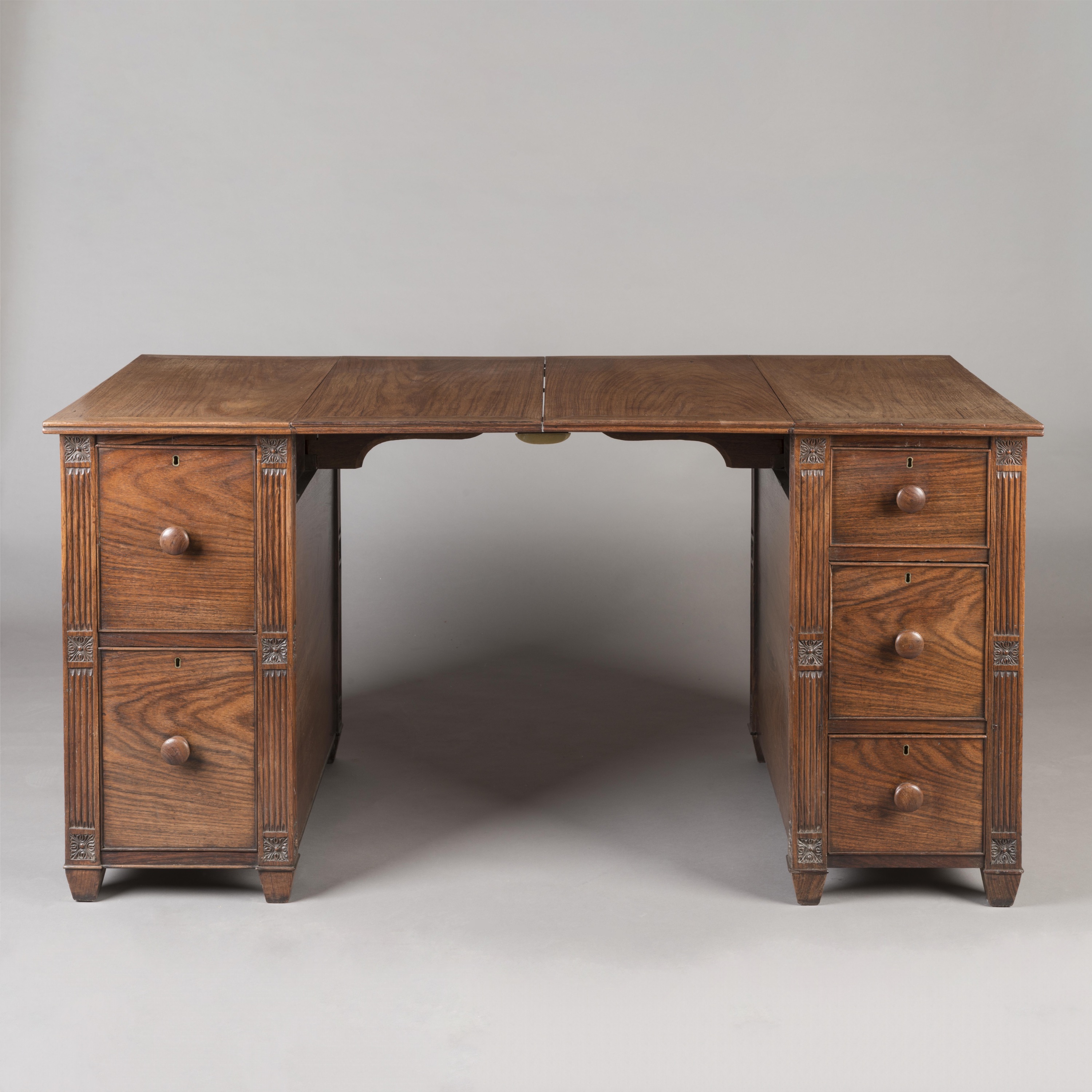 Constructed from rosewood, each pedestal supported on tapering feet, one enclosing two drawers and the other a bank of three drawers, all lockable and with turned knobs, the angles finished as fluted pilasters and carved paterae; above, the writing surface composed of two hinged drop leaves which can be assembled and separated as needed.