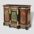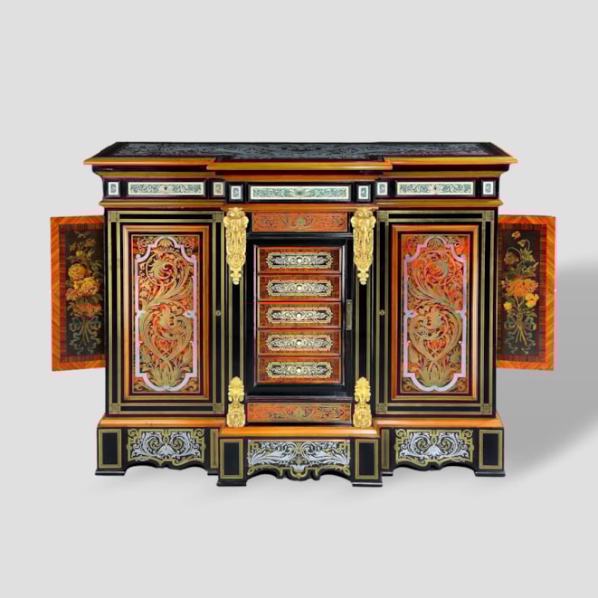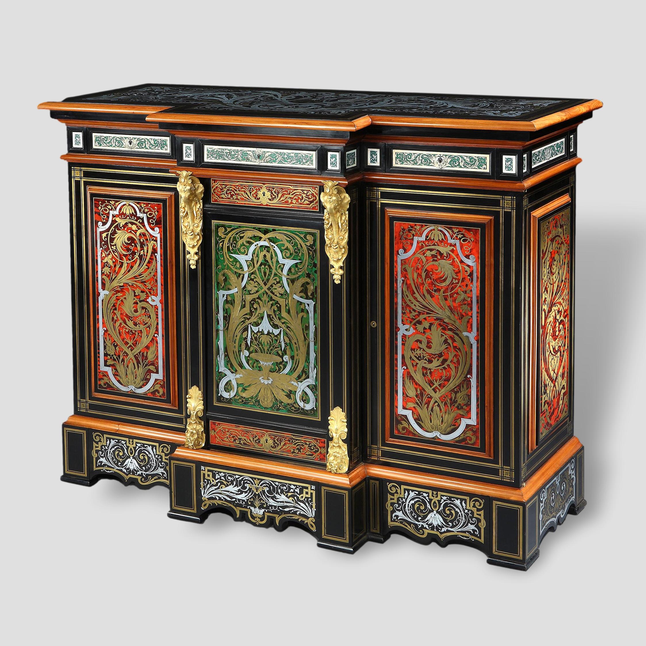 Of breakfront form, constructed with Ebony, Tulipwood and various Fruitwoods, the whole being richly and profusely inlaid with pewter, cut brass, etched and stained ivory, tortoiseshell, tinted marquetry panels, and decorated with very finely cast, planished and gilt bronze mounts.