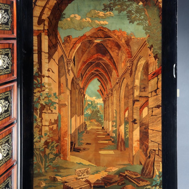 The frieze housing three long drawers, the central section having a drawer containing a writing slope with a tooled leather inset, and flanking, two small drawers to which access is concealed; below, the retractable central door dressed with a very fine marquetry panel depicting a ruined abbey, revealing five drawers when opened; the flanking doors housing shelved interiors, with marquetry panels, showing a bountiful display of flowers in urns to the reverses; and to the ends, doors with rich marquetry floral inlay revealing a miniscule shelved interior; below, the shaped apron has a pull out centre section which reveals an upholstered prieu-dieu, flanked by short drawers. Bearing the maker’s label to the reverse ‘Cremer/Fabrique de Marquetrie, Mosaique et Meubles de luxe’. Importantly, hidden in the construction of the central bank of drawers is a letter on Cremer’s notepaper, signed by Joseph Cremer, detailing his origins, the Exhibition, and the medal and reception the cabinet received; obviously intended to remain with the piece its’ whole life, as a permanent record of the importance Mr Cremer attached to the piece. Paris Circa 1848/9