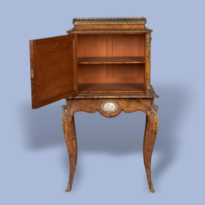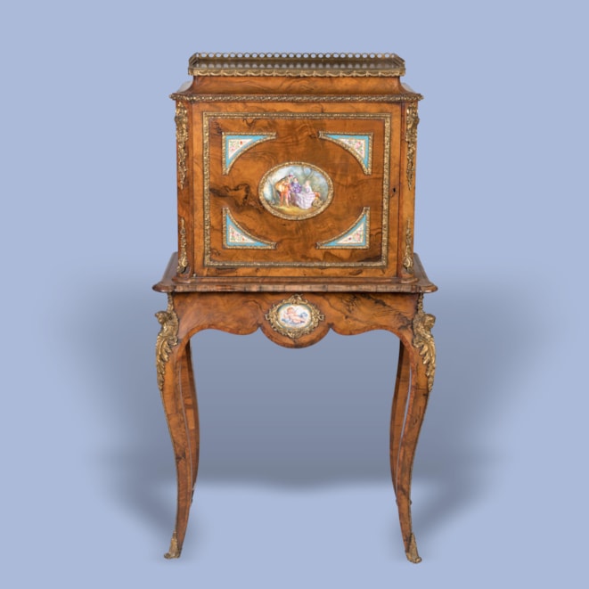 Employing fine Circassian burr walnut, decorated with blue ground 'Sèvres' porcelain panels and gilt bronze mounts, supported on cabriole sabot-shod legs headed by espagnolettes, the single-door cabinet set with an oval porcelain panel of a 'fête galante' and a further four corner porcelain panels, the interior with a single shelf, the veneered top with an ormolu lambrequin surround and three-quarter pierced gallery.
