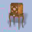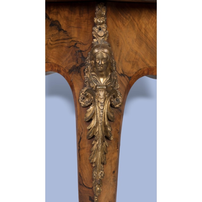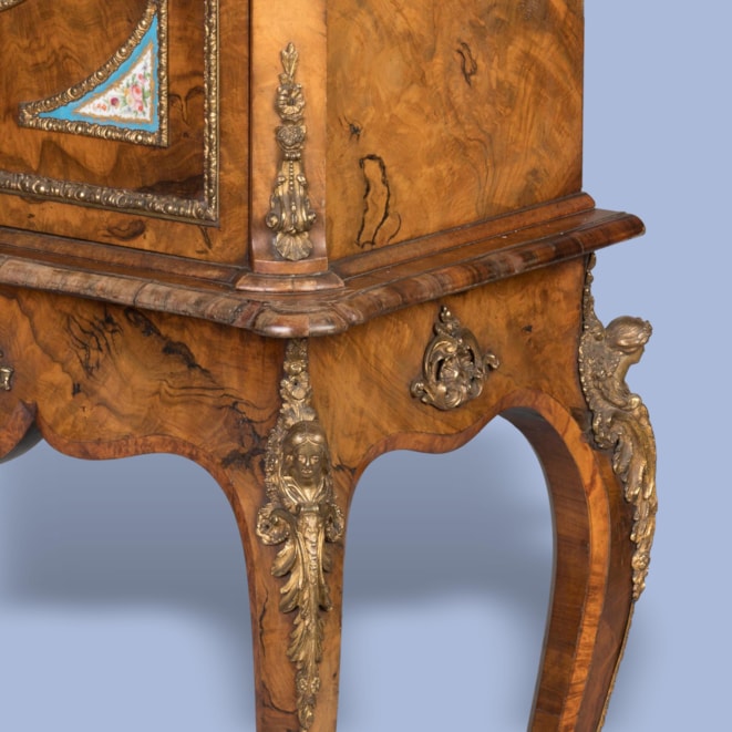 Produced by several cabinetmakers, a variation of this design was shown at the 1851 Great Exhibition and a related example was likely purchased in 1846 by Prince Albert for Queen Victoria. Unlike those examples, the present cabinet employs walnut, a very English timber.
