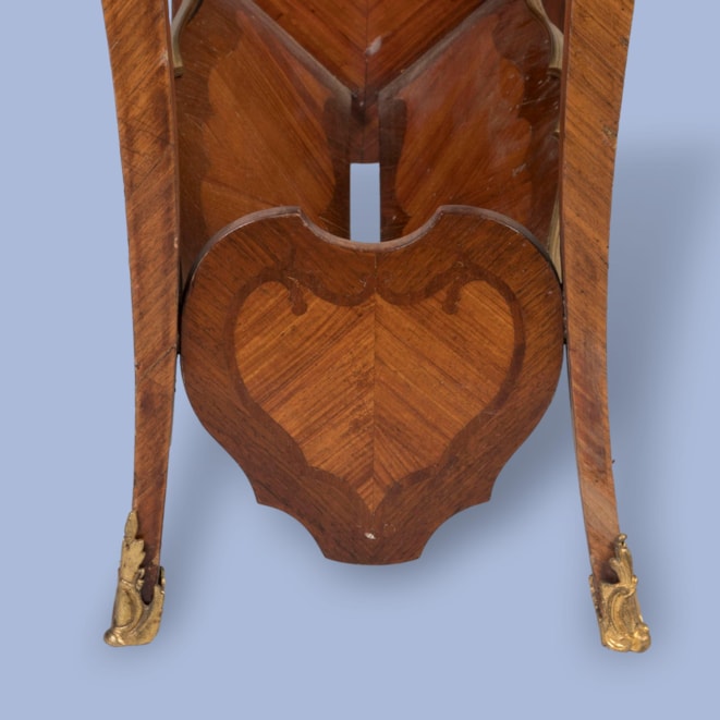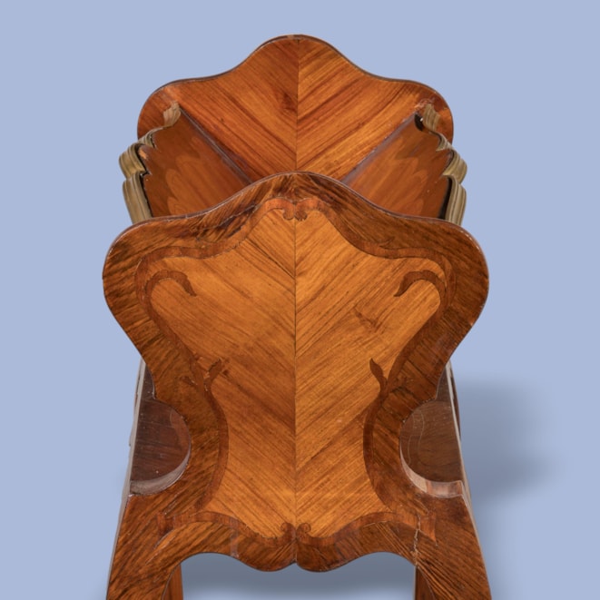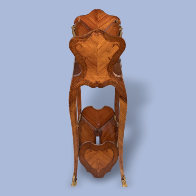 Of elegant serpentine design, the bookstand veneered with bookmatched kingwood and crossbanding, supported on cabriole legs with foliate sabots, joined by a lower bookshelf tier, the upper register of conforming design allowing for ample book storage.