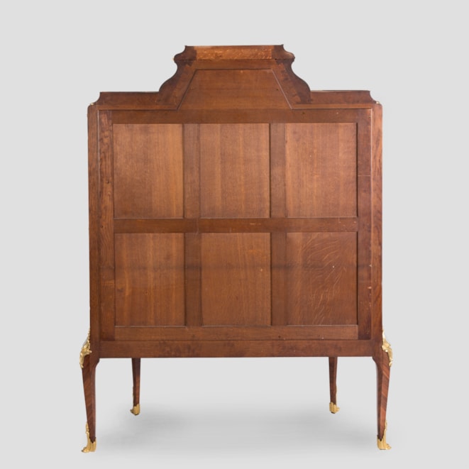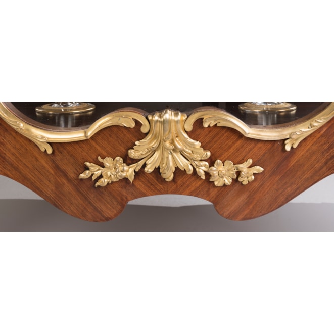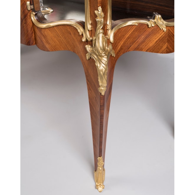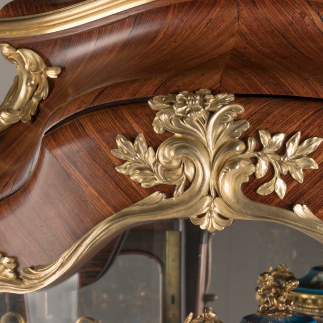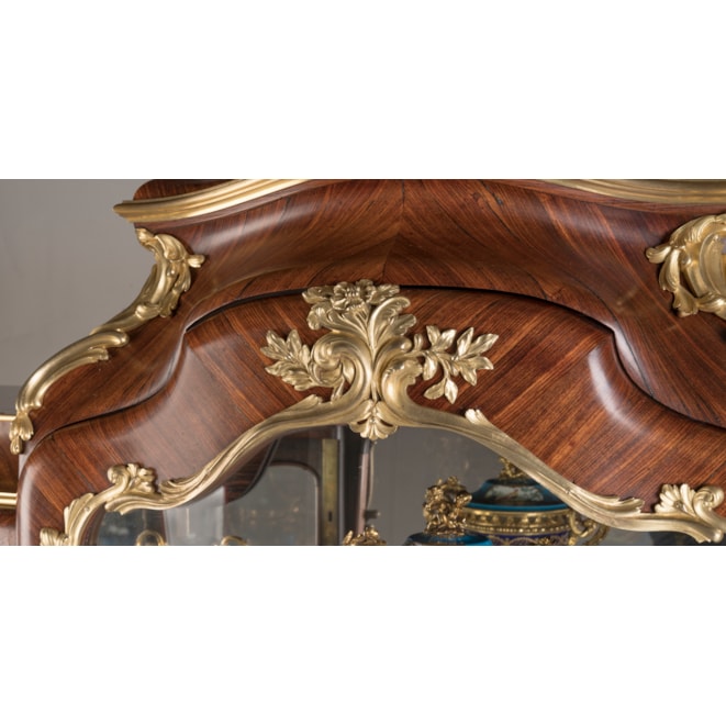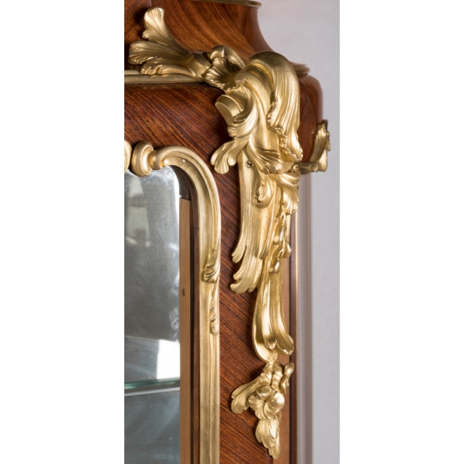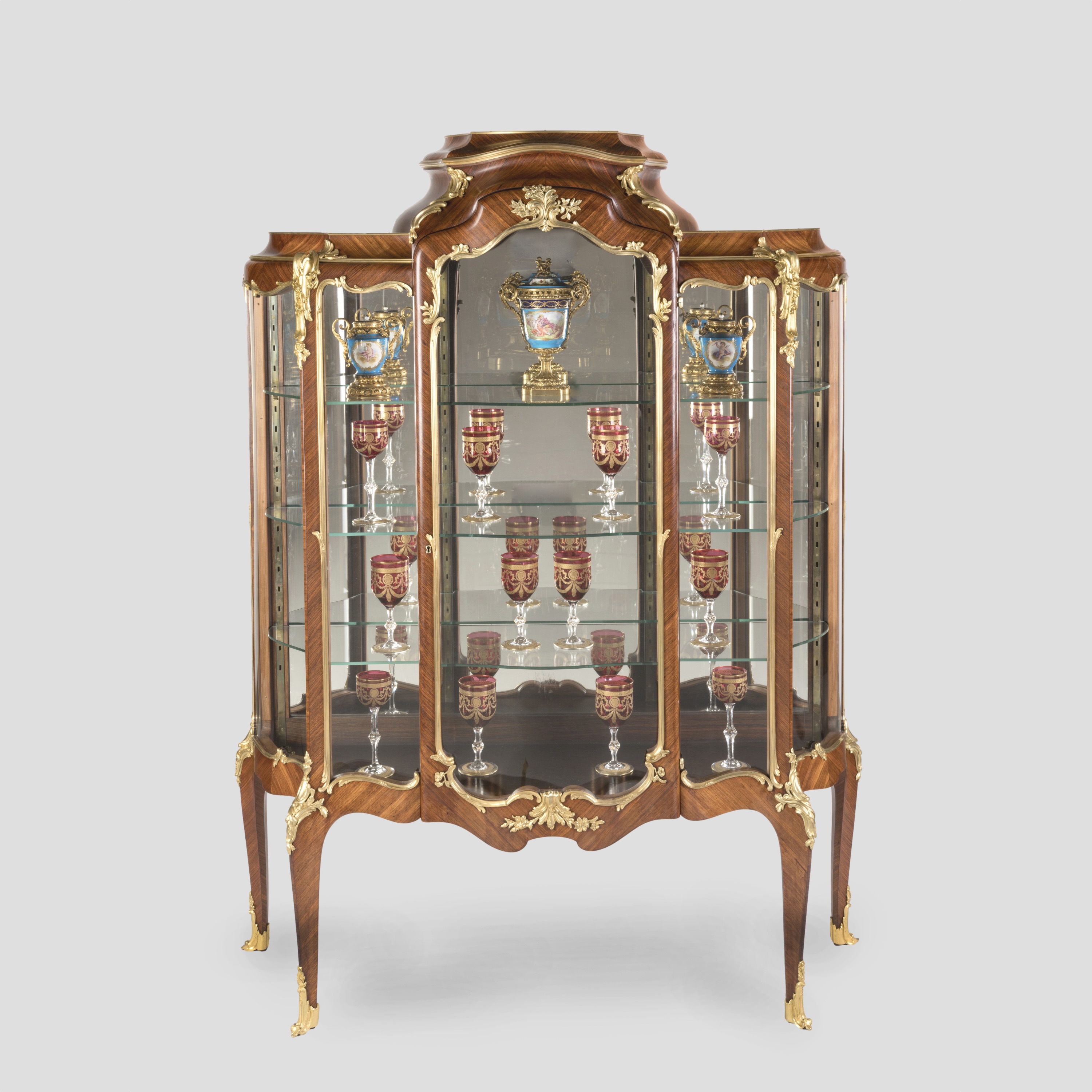 Of bombé form, constructed from kingwood, skilfully bookmatched throughout and dressed with extensive fire gilt bronze mounts, the cabinet standing on four cabriole legs with foliate cast sabots and stylised acanthus clasps to the knees, the glazed and curved sides flanking a tripartite front centred by a hinged door enclosing the mirrored interior with three adjustable glass shelves, the pediment top with curved mouldings and stylised acanthus leaf ormolu mounts.