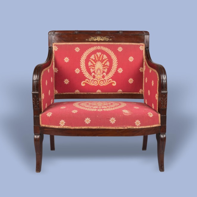 The chair and its upholstery are directly inspired by the bergère made by François-Honoré-Georges Jacob-Desmlater for Queen Hortense when she ruled over Holland alongside her husband Louis Napoleon, the French emperor's brother. Her son would later also become Emperor of the French as Napoleon III.