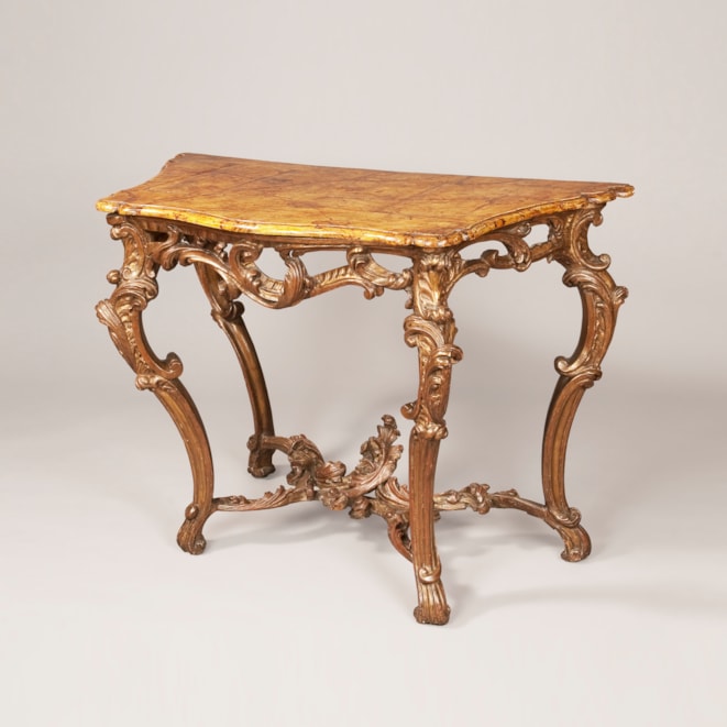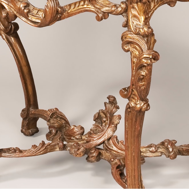 The bases in carved giltwood, with walnut tops, of arc-en-arbalette form, with re-entrant lobed corners; the legs rising from knurled feet, of sinuous form with richly carved foliage, and conjoined by a swept stretcher, with conforming foliate carving, and ācā scrolls, with a stylised flambeau at the confluence. The apron is pierced and carved in a similar exuberant manner. Italy, Circa 1730