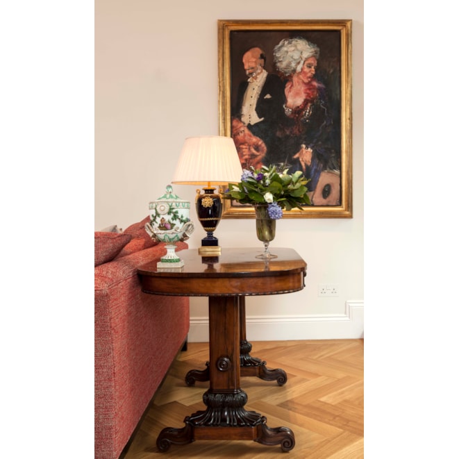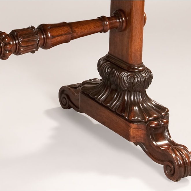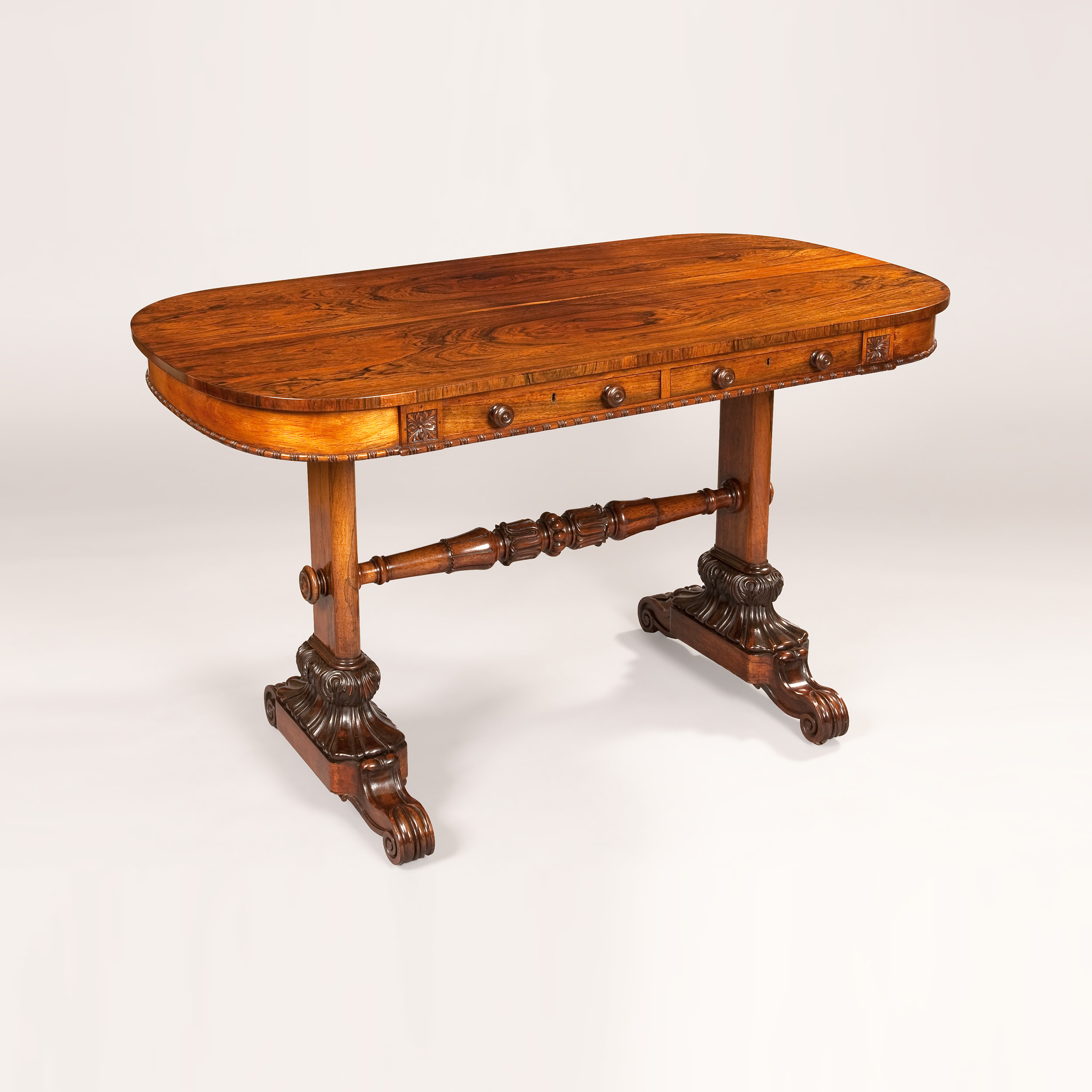 Constructed in a very fine and distinctively marked goncalo alves; of end support form, rising from a scrolled slab base, adorned with lapetting to the toes, lobed feet issuing the supports, which are of severe oblate form, with a double ended tapering ring turned central stretcher, with ring bosses. The ceinture, with paterae tablets, houses two lockable drawers with turned wood pulls, having internal quadrant beading, and a running egg and dart moulding and over, a top having radiiused corners. Circa 1825