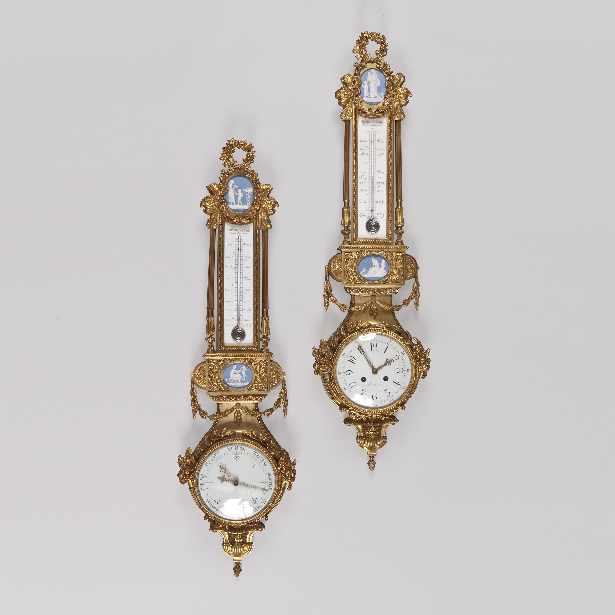 In the Louis XVIth manner, of banjo form, the cases being in crisply cast bronze, with ormolu gilding, with Wedgwood type jasperware plaques having designs by John Flaxman within neo-classical frames dressed with addorsed gryphons; the putti capped columns representative of zephyrs above the stiff leaf framed circular dials house Reamur mercury thermometers; the surmounts being laurel wreaths, and the lower parts having a triangular pendant of foliate form with inverted pineapples: draped swags adorn the cases; the barometer of aneroid type, with the climate gradations betwixt ‘Very Dry’ and ‘Tempest’; the dial signed ‘Carcany’ above a fleur-de lys: the clock having an eight day striking Marti movement, with a lever platform escapement, signed ‘Robin’, the hours and minutes delineated in Arabic numerals, enamelled on a porcelain face. France, Circa 1875