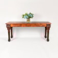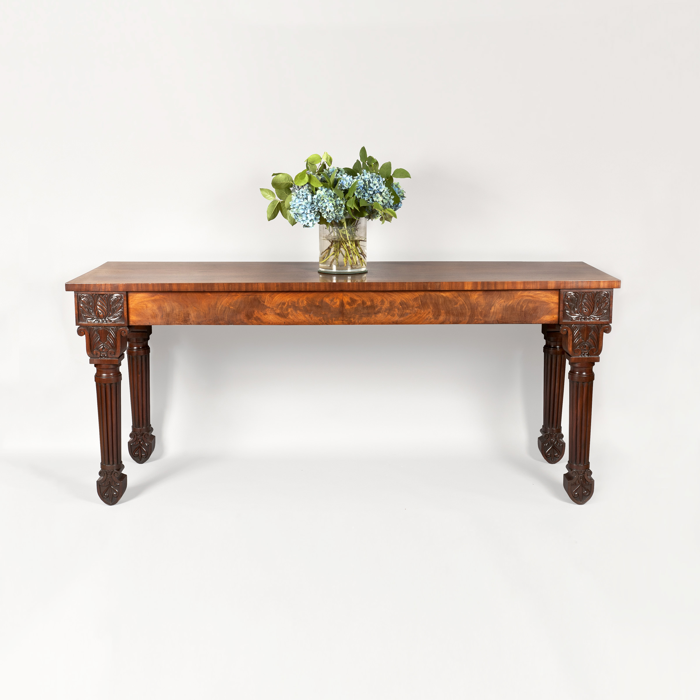 Constructed in mahogany, of rectangular form, and rising from sagittiform feet, with inset carved foliates in the Roman manner, with ring turned and fluted legs capped with capitols of Tuscan form; the front apron set with tablets, with conforming carving. Circa 1825