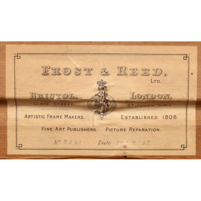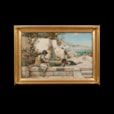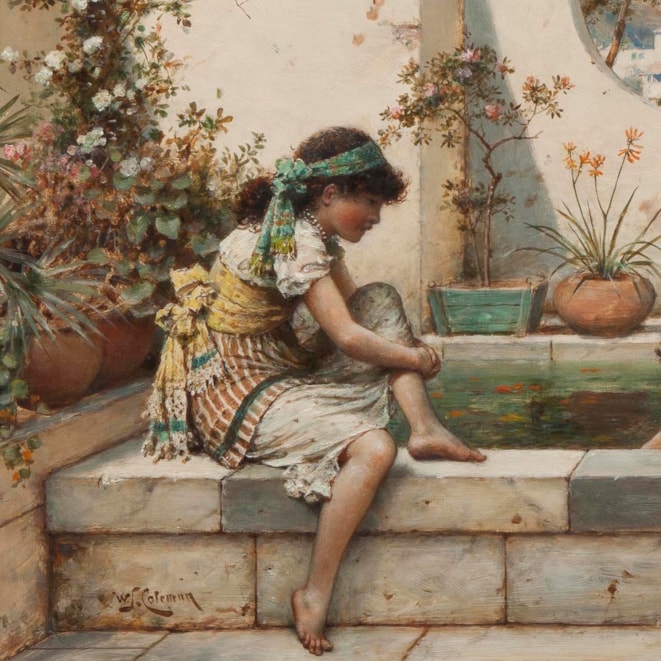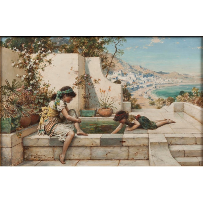 Depicts two young girls sitting and playing in the water of a lily pond in a garden at a villa, against a landscape background of a coastal city. Possibly located on the Mediterranean Sea. Oil on canvas, signed Lower Left, bearing a Frost and Reed label to the reverse for April 1939