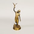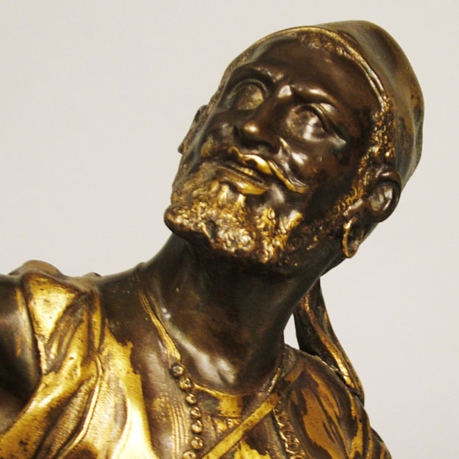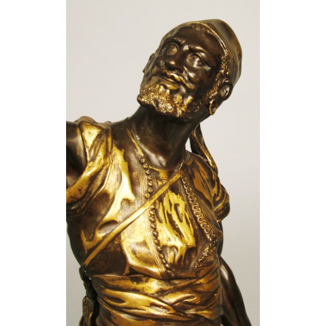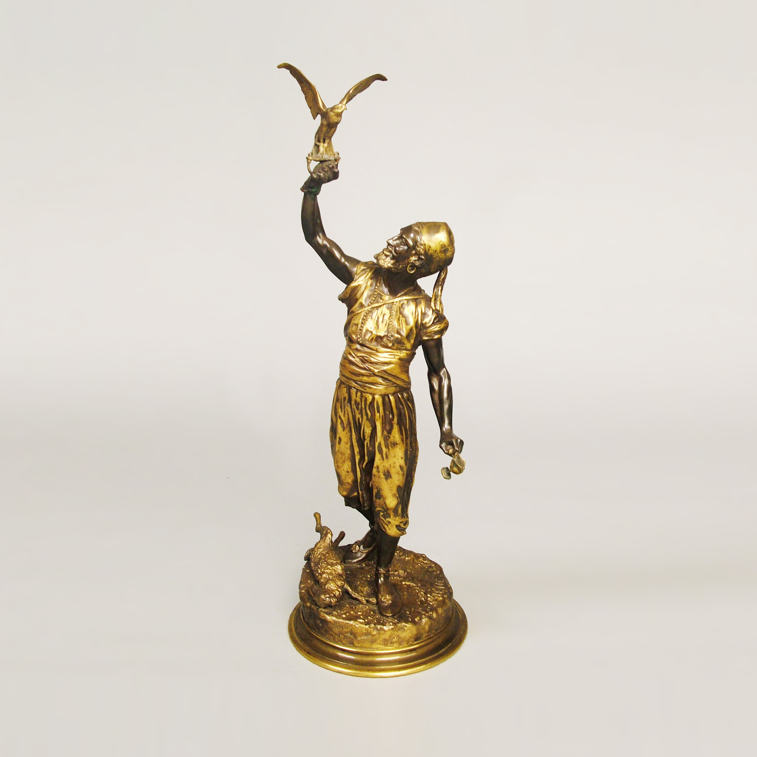 The finely cast and planished bronze, depicting a falconer walking on a naturalistic ground, with a hare at his feet, the falcon on a hand held mount, is decorated with gilt highlights, signed by the maker and dated 1873.