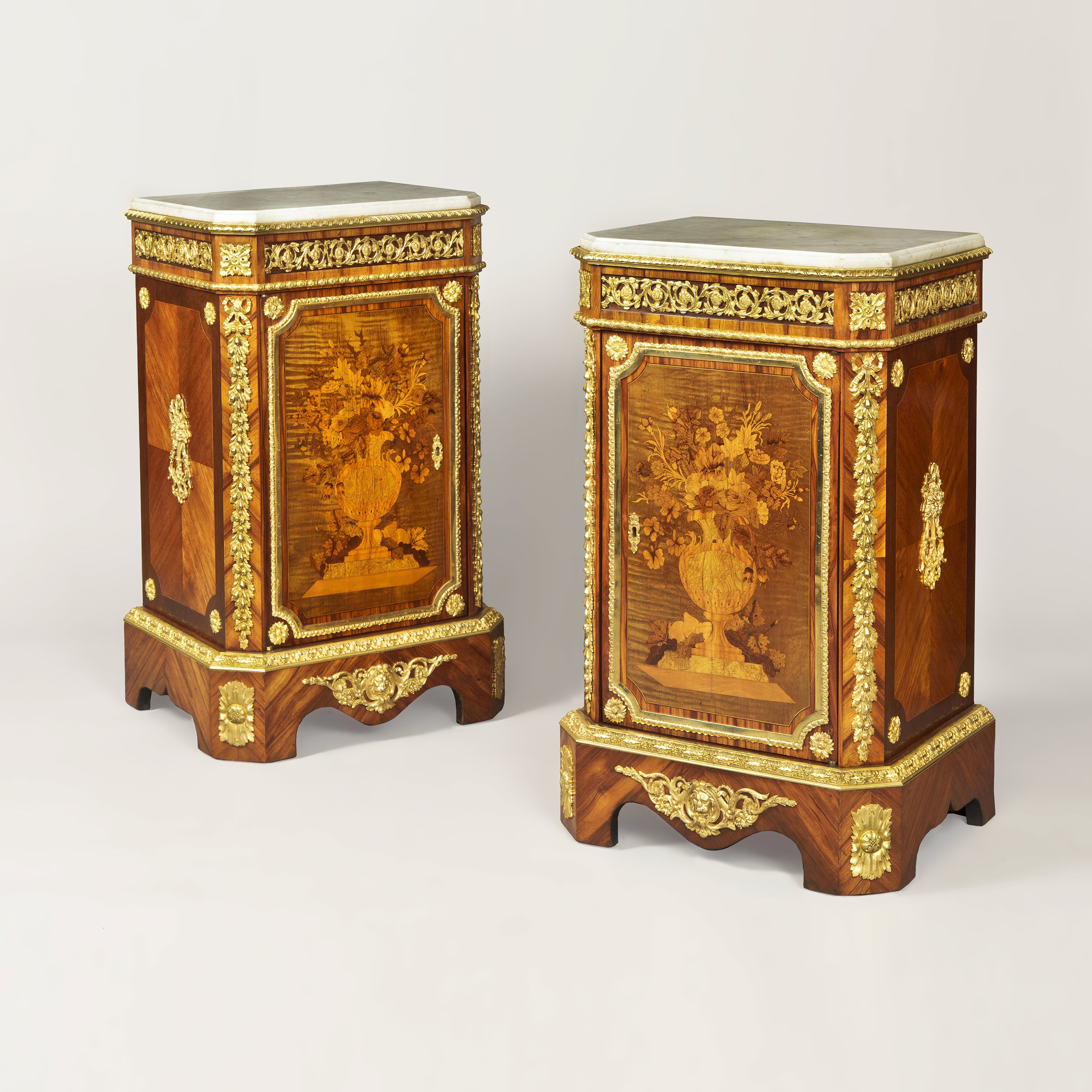 Constructed in kingwood, with gilt bronze mounts; rising from bracket feet, the cabinets, a true left and right pair, have central doors dressed with well executed floral marquetry panels, enclosing shelved interiors; the canted angles are adorned with pendant fruiting foliates with lovers bows atop; the sides dressed with gilt bronze bouquets, and over, fitted with thumbnail edged white Carrara marble tops, within gilt bronze gadroon frameworks. French, Circa 1870