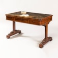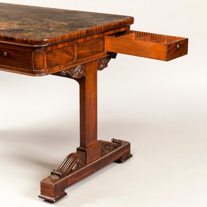 Constructed in mahogany, of exemplary colour and patination; of freestanding end support form, the base platforms dressed with precisely carved spandrels in the Grecian manner, and having inset integral castors; a long central drawer, flanked by smaller drawers, and, unusually, addorsed drawers in the ends, all mahogany lined and with quadrant mouldings, and dressed with circular brass keyhole escutcheons; the writing surface having radiused corners, and fitted with a tooled Morocco leather of mellow colour. Circa 1825