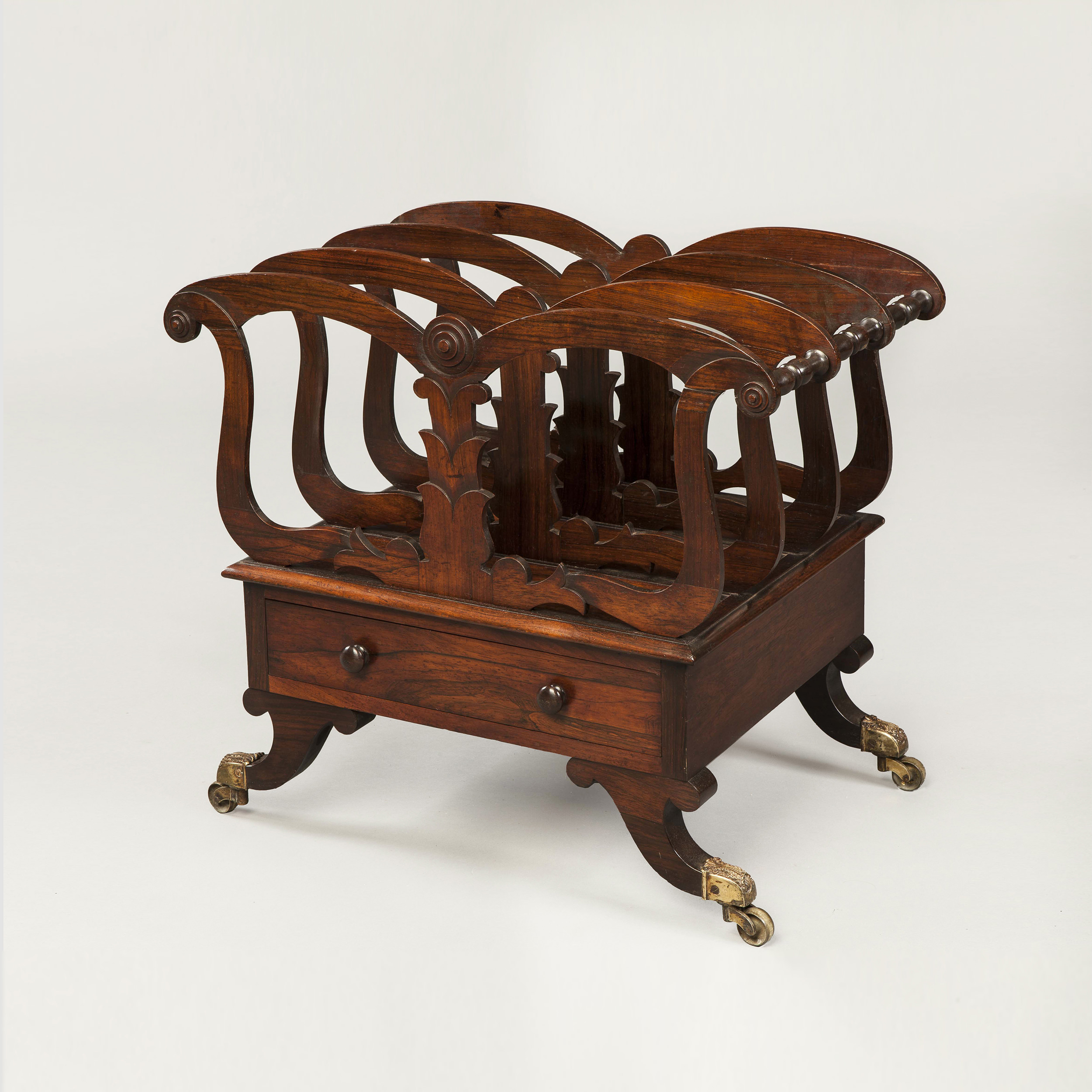 Constructed in Rosewood, with four divisions, the top rail of arc-en arbalette form, with turned dividers; the central support in the form of a stylised palm tree trunk; a single mahogany lined drawer below, and rising on swept legs terminating in chased brass casters.England Circa 1815