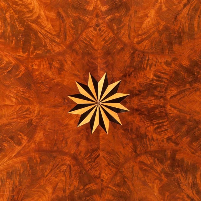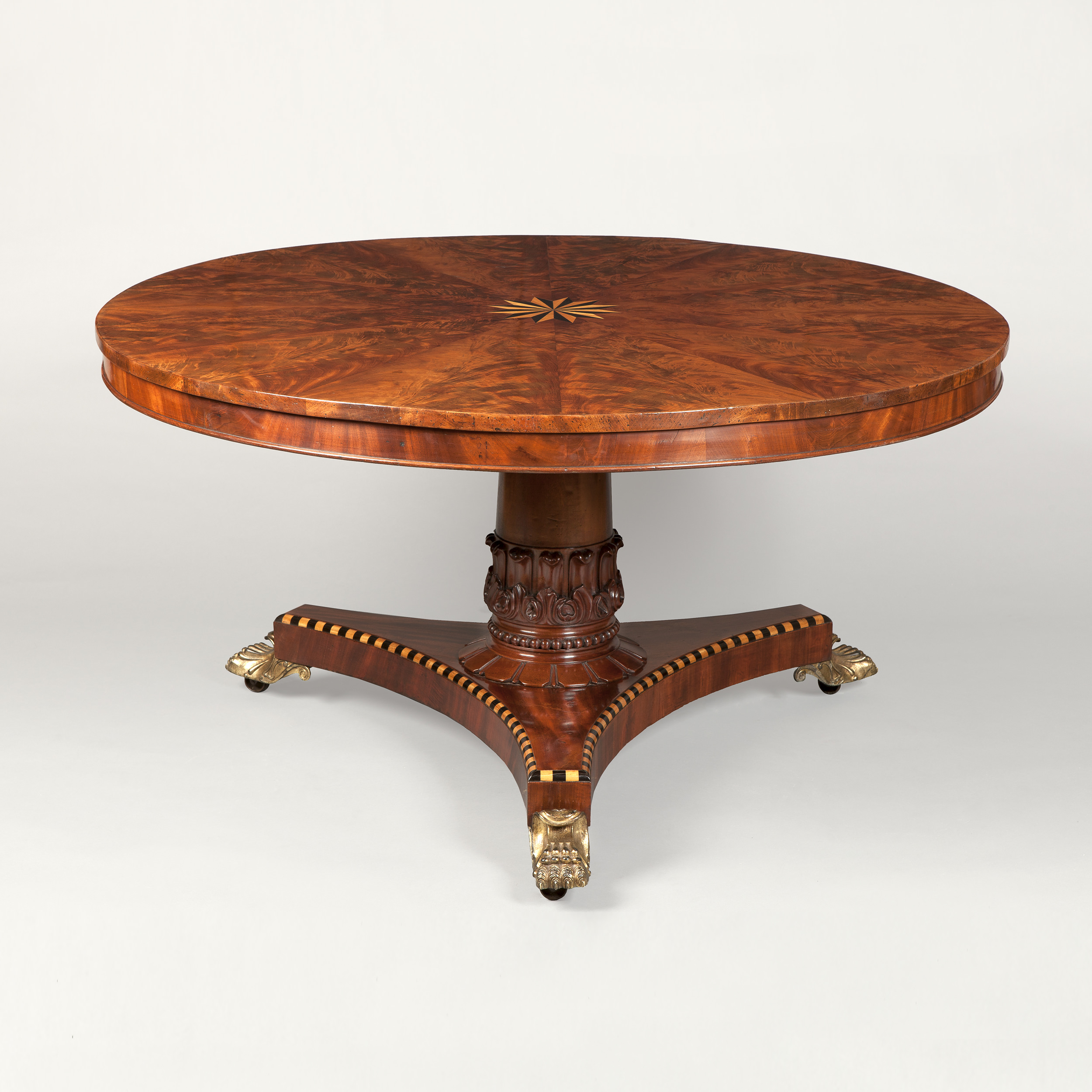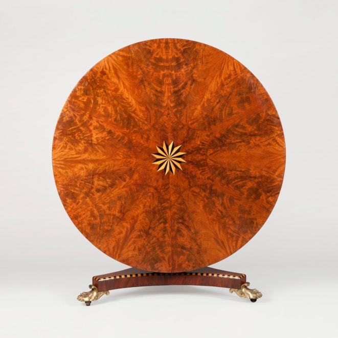 Constructed in cuban mahogany, with holly and bois clair inlays; the circular tilt top having radially laid flame Mahogany veneers of magnificent figuring and colour, with a ‘starburst’ inlay to the centre; supported by a turned and tapering column, carved with lotus leaves and lobbing, set on a tripartite inlaid platform base with ‘lion’s paw’ gilt bronze mounts.