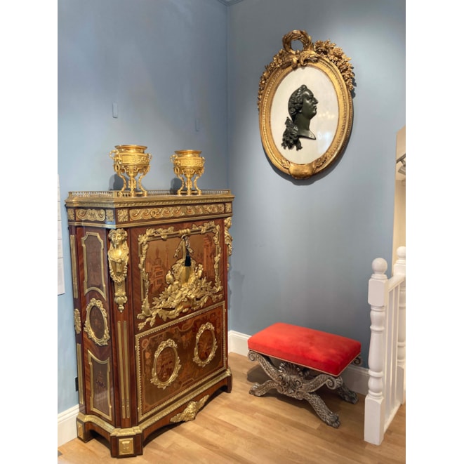 Pierre-Antoine Foullet received as Maître on 11th April 1765. This celebrated secretaire by Pierre-Antoine Follet, dating to 1777, had at one time in the early 19th century been in the collection of the d’Hane-Steenhuyse Family of Ghent, and was acquired by the 4th Marquess of Hertford before 1870, appearing in the Rue Lafitte inventory of 1871. Exhibited at Bethnal Green from 1872-1875 (when, presumably, access was granted to prepare the ground work for the Maison Rogié piece). In 1898 it was recorded in the Hertford House inventory as being situated in the Canaletto Room. At present, it is on display in tandem with our piece, a wonderful and probably one –time opportunity to see these pieces together.