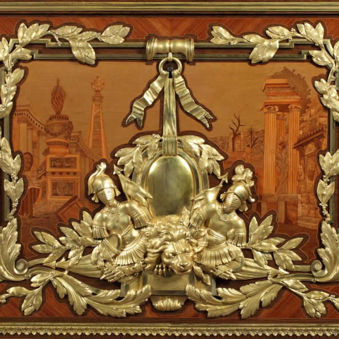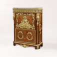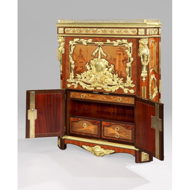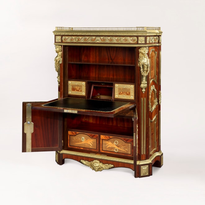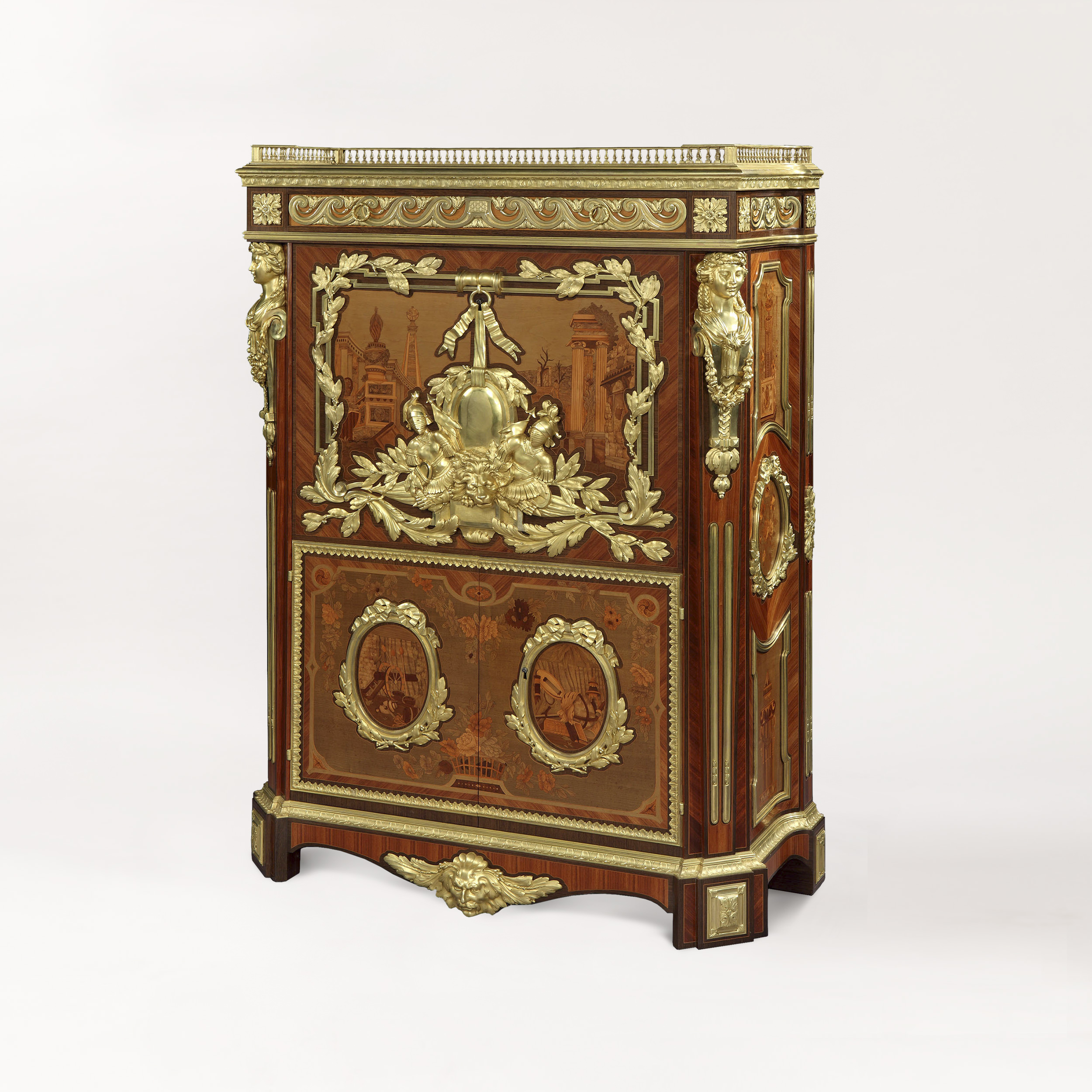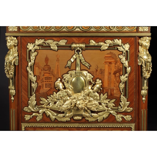 Constructed in kingwood, cross banded in tulipwood and purpleheart, having contrasting specimen woods used in the marquetry inlay, extensively dressed with gilt bronze mounts of the highest quality; the bracket feet conjoined by a shaped apron, sporting a centrally sited ormolu winged male profile, and incurved sides; the canted front angles dressed with female caryatids; the upright concave sides having centrally sited elliptical floral marquetry panels enclosed within ormolu frames, with panels of marquetry inlay depicting architectural subjects within shaped serpentine frames; the lower compartment having two doors veneered with elliptical panels of marquetry within conforming gilt bronze frames, centred in a field of floral marquetry, arising from a bouquet, enclosing an interior fitted with four marquetry worked drawers and a pigeon hole; the upper compartment, a counterweighted and lockable drop-front is veneered with panels of pictorial marquetry depicting classical architecture framed within an ormolu leaf cast frame, incorporating a pendant trophy flanked with two helmeted cuirasses either side of a lion, whose head projects over a central bracket; within the fall front are shelves and two marquetry inlaid drawers, four secret drawers and a leather tooled writing surface; the upper apron is dressed with ormolu Vitruvian scrolls with square paterae at the angles, and over, a three quarter baluster gallery enclosing a Carrara marble top. One bronze mount stamped ‘Rogié’. French, Circa 1880
