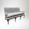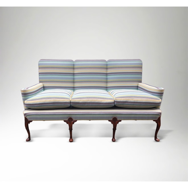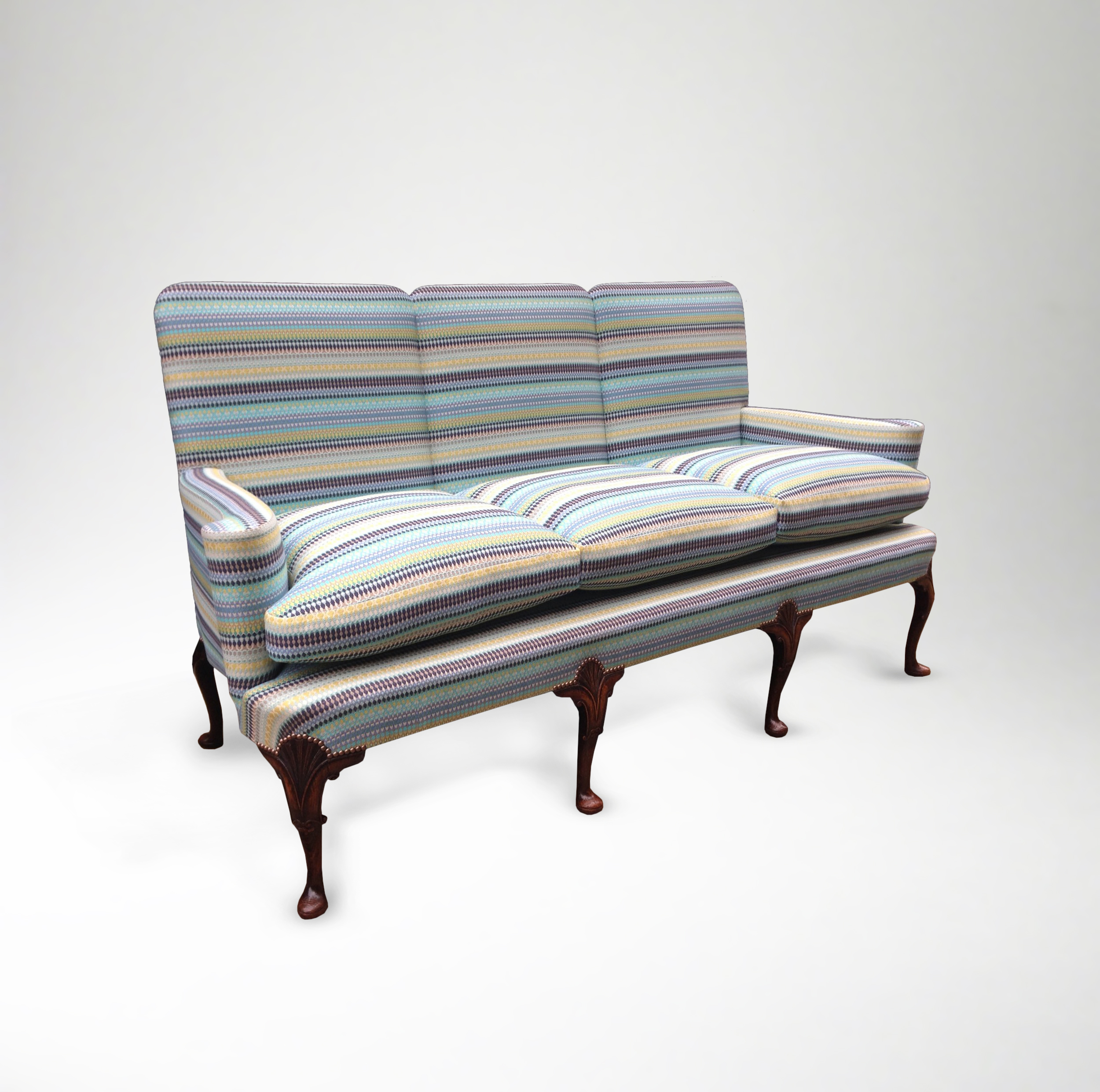 Constructed in walnut, the strapwork carved cabriole legs having quadrant scallop shells over, with pad feet, to front and rear; the swept form framing the square section back. Circa, 1910