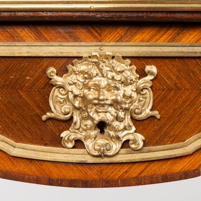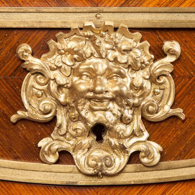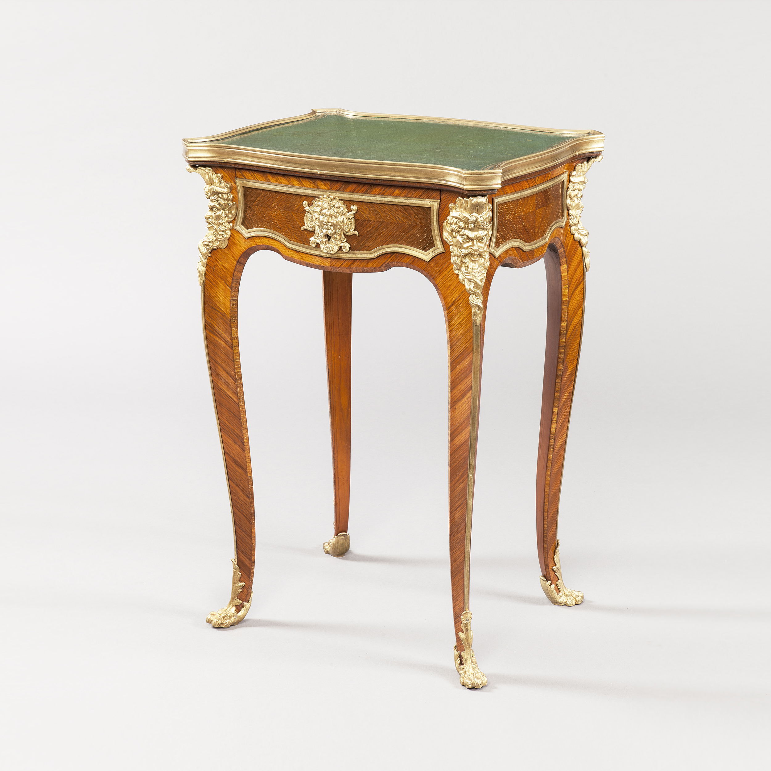 Constructed in kingwood, and dressed with fine quality bronze ormolu mounts; rising from swept cabriole legs adorned with ormolu ‘animal paw’ feet, with ormolu masks of the God Pan at the shoulders; the body houses a single oak lined lockable drawer (the original key present), the keyhole sporting an ormolu mask of a grinning Bacchus; the top of square serpentine form, lined with gilt tooled green leather. French, Circa 1870