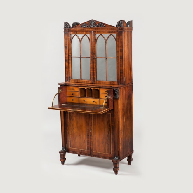 Constructed in a finely faded and patinated goncalo alvez, having holly and purpleheart stringing; with satinwood to the secretaire interior; rising from tapered square section collared legs, the lower section, having an pair of enclosed fielded panel doors, houses a shelved interior flanked by Pharonic Herms; the lockable drop-down writing secretaire drawer is opened using elliptical gadrooned wood handles, and supported by brass quadrants; fitted with an arrangements of pigeon holes and drawers, holly inlaid; over, the two mirrored doors have Gothic astragals, enclosing a shelved interior; the triangulated pediment is adorned with palmettes, and the shaped acroteriae at the angles are conformingly decorated. Circa 1810