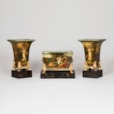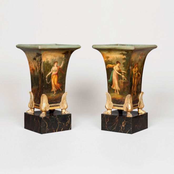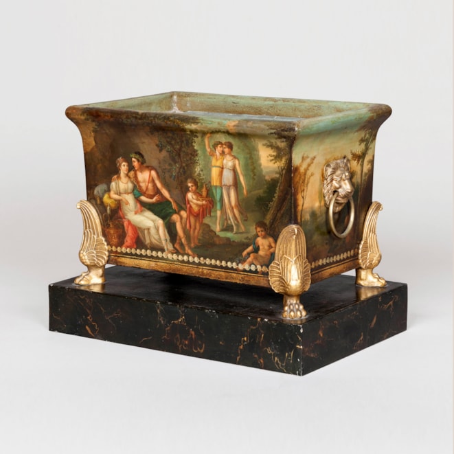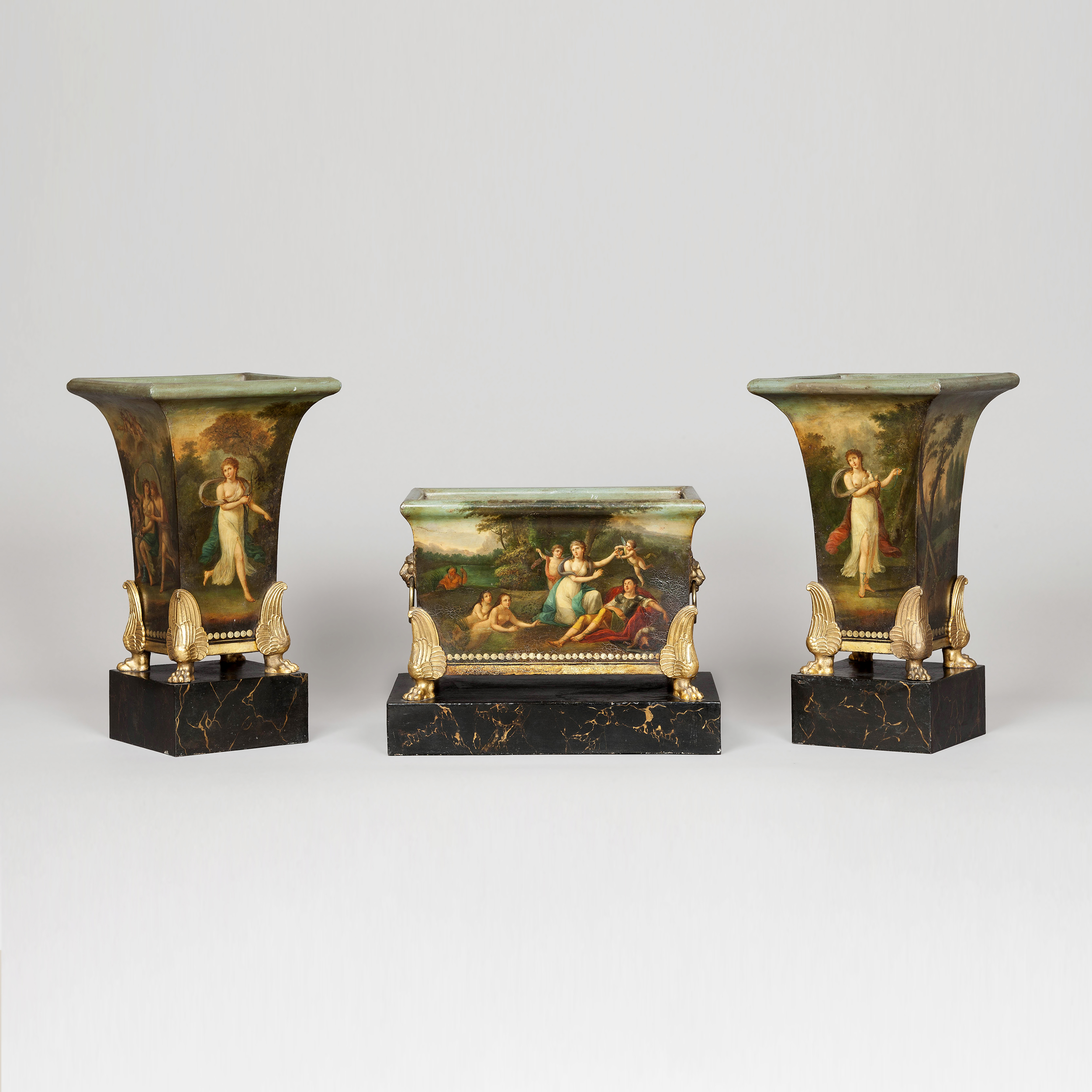 Constructed in tole, being hand painted and decorated in the French Empire neo-classical manner of Jacques-Louis David; the bases decorated in faux marble, the central, larger jardinière of oblong everted form, rising from winged paw feet, and dressed with lion mask handles, being flanked by square vases of a similar form. With later zinc removable liners. French, Circa 1820