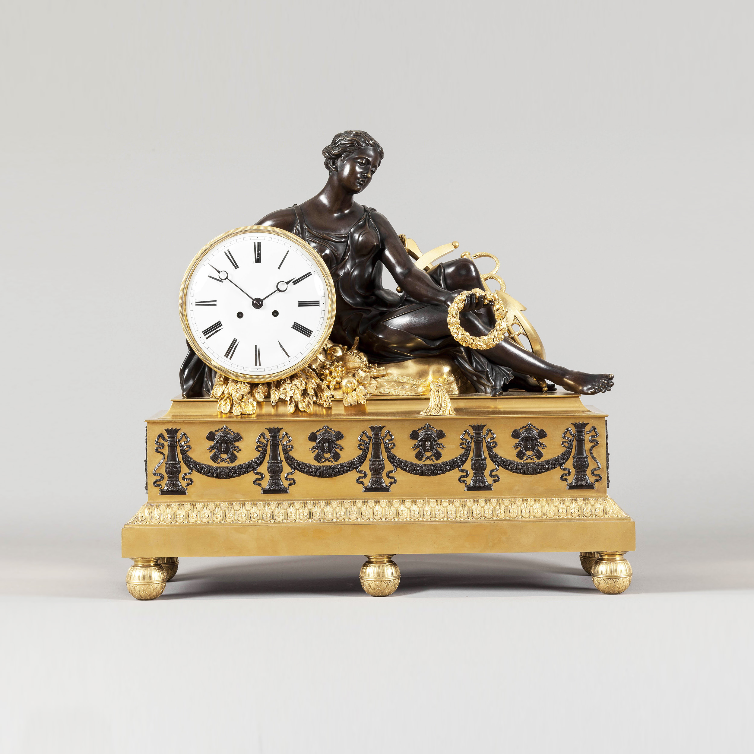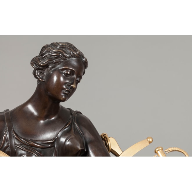 Constructed in bronze, patinated and gilt; the rectangular form case supported on engraved oblate spherical feet, the frieze dressed with a row of female masks capping pillars, linked with ribbands, from designs by Percier & Fontaine; seated on a richly embroidered bolster, the classically draped female figure, emblematic of Victory, proffers a laurel wreath, with an anchor and the caduceus of Mercury alongside; the eight day movement strikes the hours on a bell, the 9 inch white enamel dial having the hours delineated in Roman numerals, and indicated with blued steel hands. French, Circa 1870