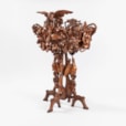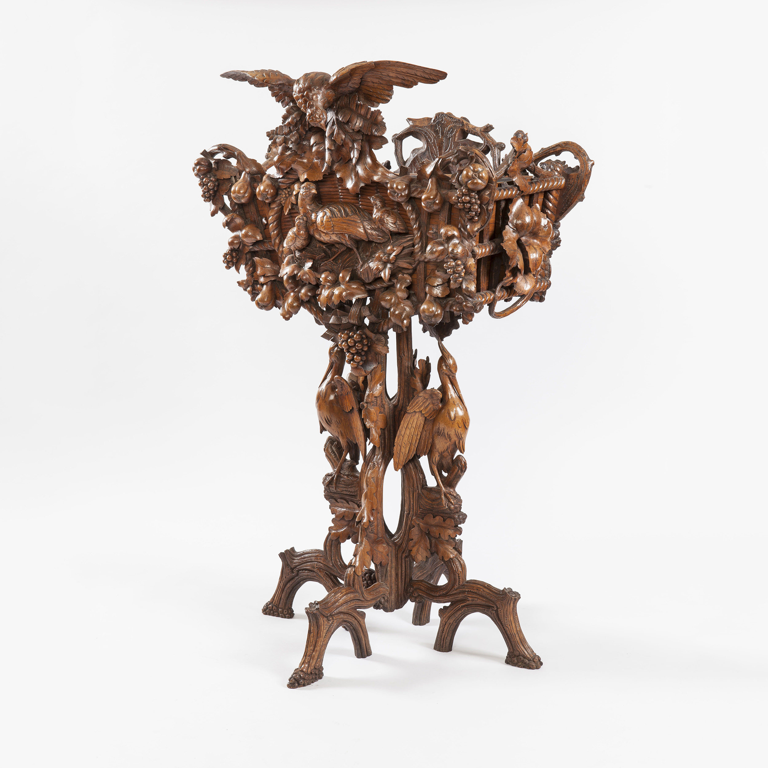 Constructed in a well carved lindenwood, rising from quadripartite feet, naturalistically, representing branches, supporting a tree form central column dressed with two storks, and supporting a carved rope dressed rectangular plant trough, profusely carved with fruiting vines, pears, oak leaves and doves, having an eagle surmount. German, Circa 1880