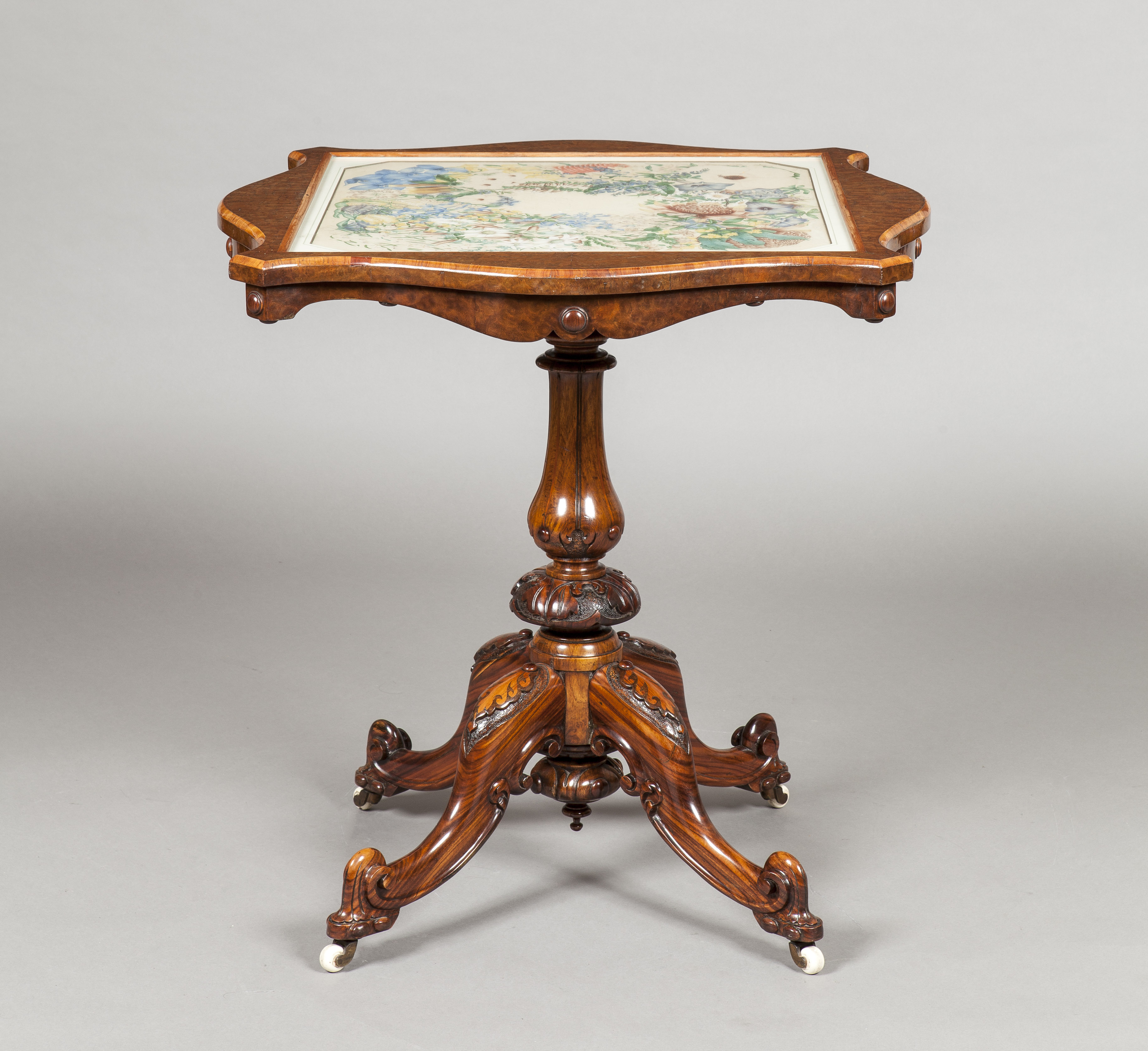 Constructed in walnut; rising from a quadripartite base, the cabriole and hipped legs with scrolled toes, and a central carved oblate pendant finial; the tapering and turned column, carved with foliates, and having a serpentine shaped tilt top platform, inset with a watercolour, under glass. Circa 1860