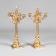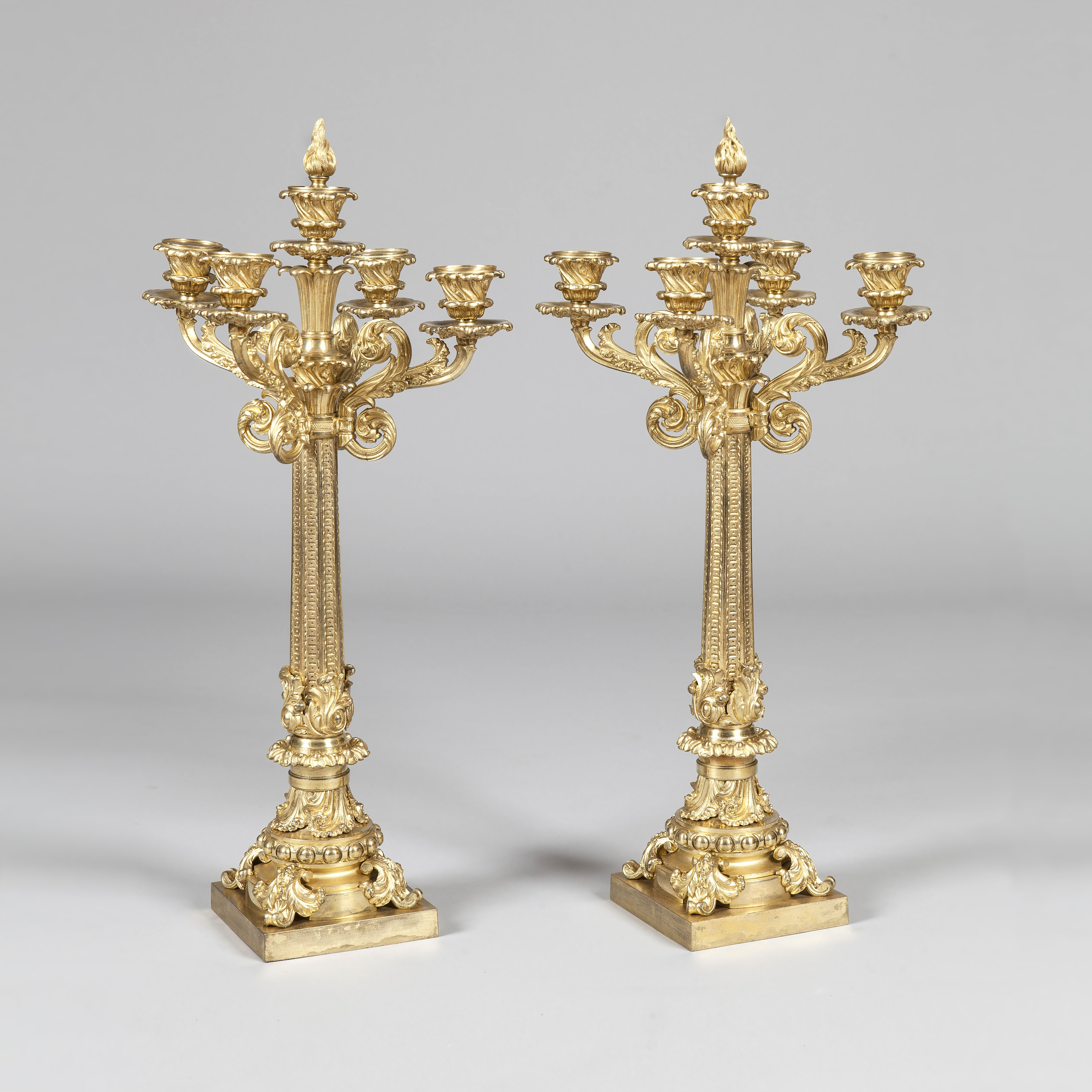 Constructed in gilt bronze; rising from square bases, with scrolled plinths supporting octagonal sided imbricated cast columns, each having four ‘S’ scrolled and decorated candle arms, and central candle holders with removable flambeaux snuffers. English, Circa 1845