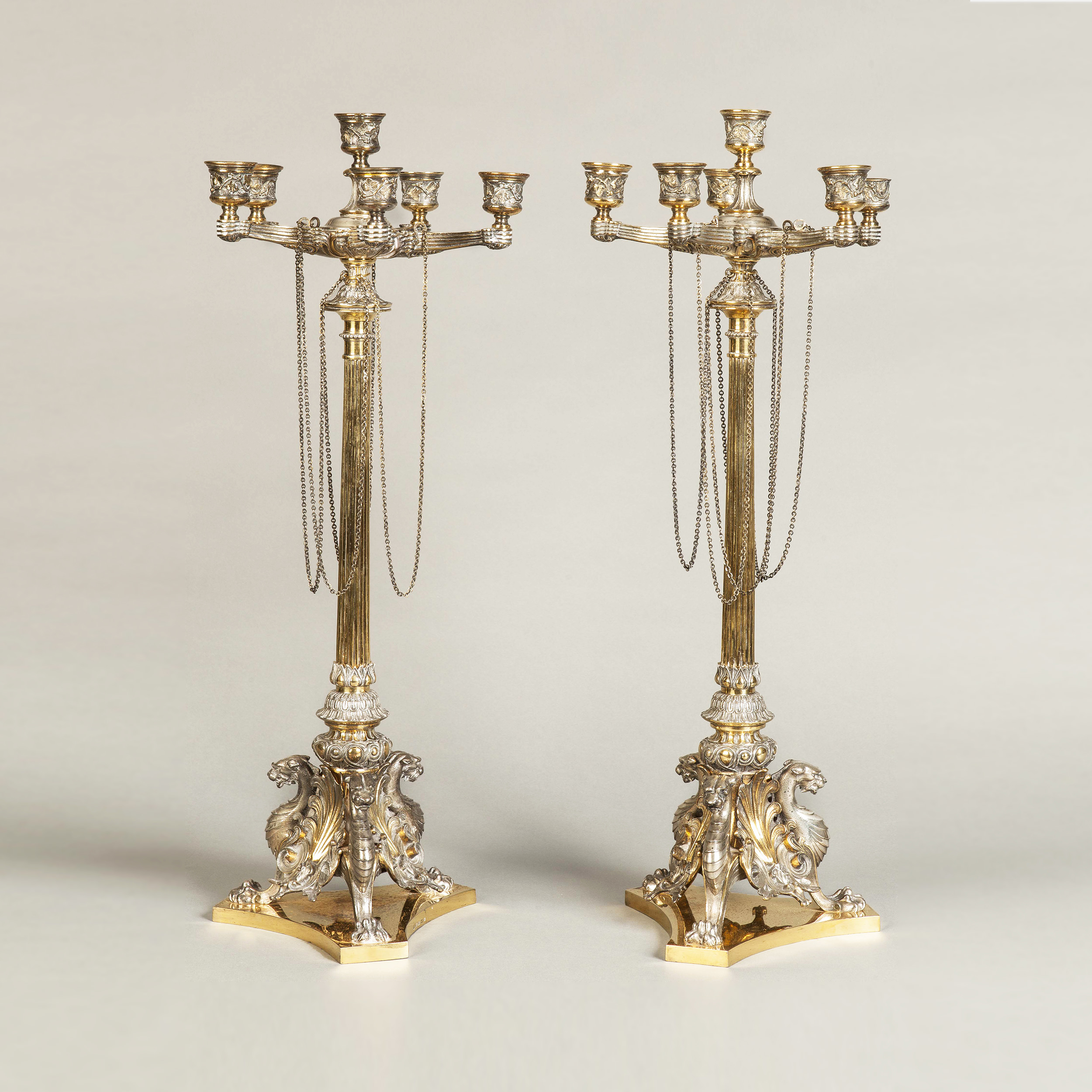 Each with 6 curved candle branches, the reeded column raised on a foliate shell and griffin tripartite base and decorated with hanging chains.