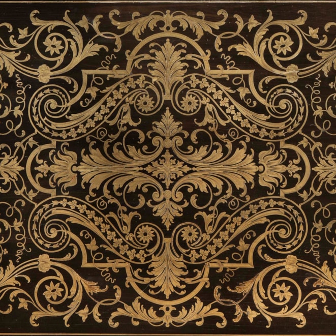 Andre-Charles Boulle (1642-1732) was received as a Maître Ébéniste in 1666, quickly becoming known as ‘the most skilful artisan in Paris’, and was appointed ‘Ébéniste du Roi’ in 1672, when he became a resident of the Louvre Palace, and was granted the especial privilege of being permitted to work in both bronze and wood. Although not the inventor of the method of inlaying the combination of ebony, tortoiseshell and brass, his ability and creative ability in the medium became at once associated with the patronymic, ‘Boulle’ and many of his masterpieces, which are represented in many museums and prestigious Royal collections throughout the world.