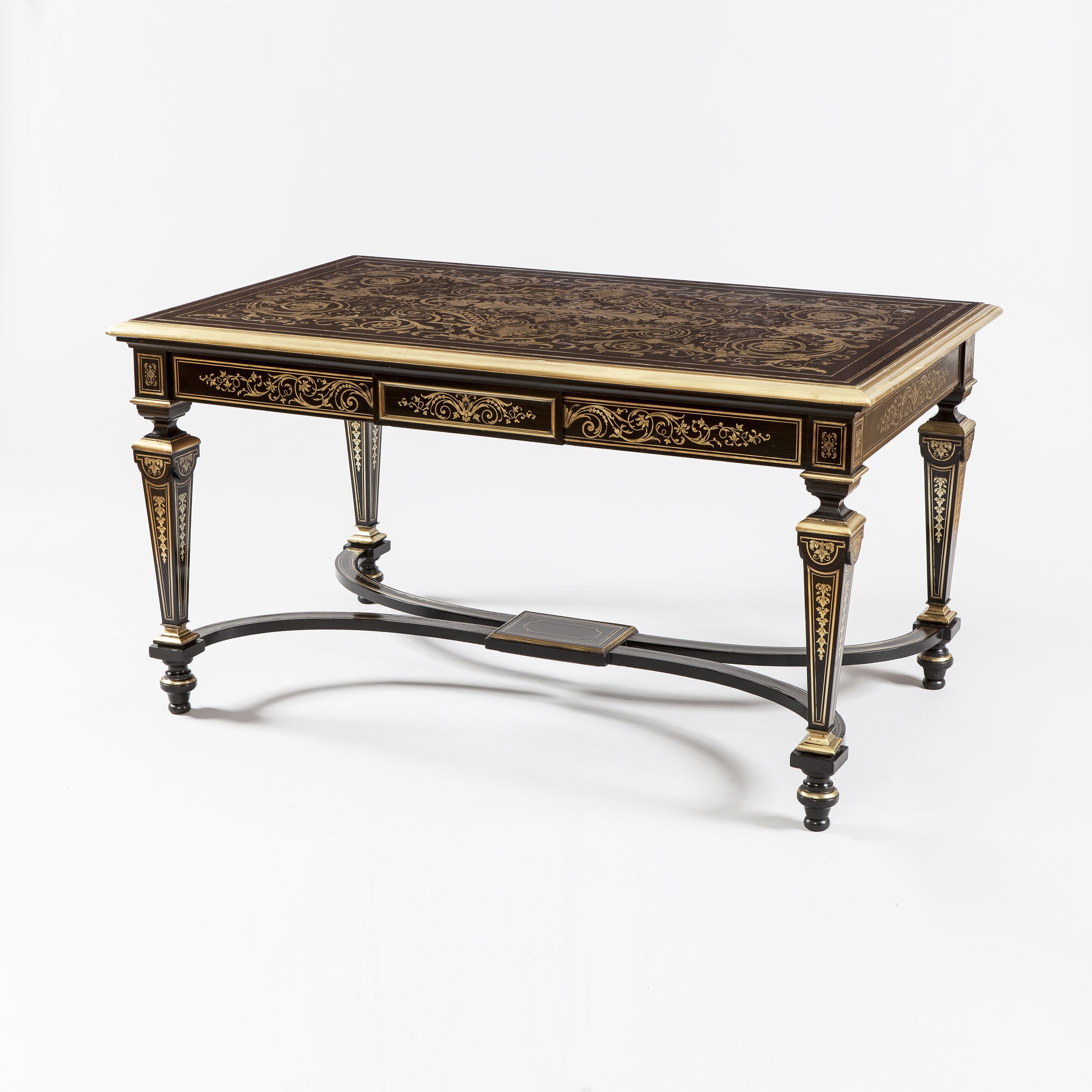 Of rectangular form, constructed in Bois Noirci and cut brass, using complex arabesque designs in the manner of Jean Berain; rising from square tapering collared legs conjoined by a stylised stretcher of ‘X’ form issuing from a central tablet; having three drawers to the frieze.