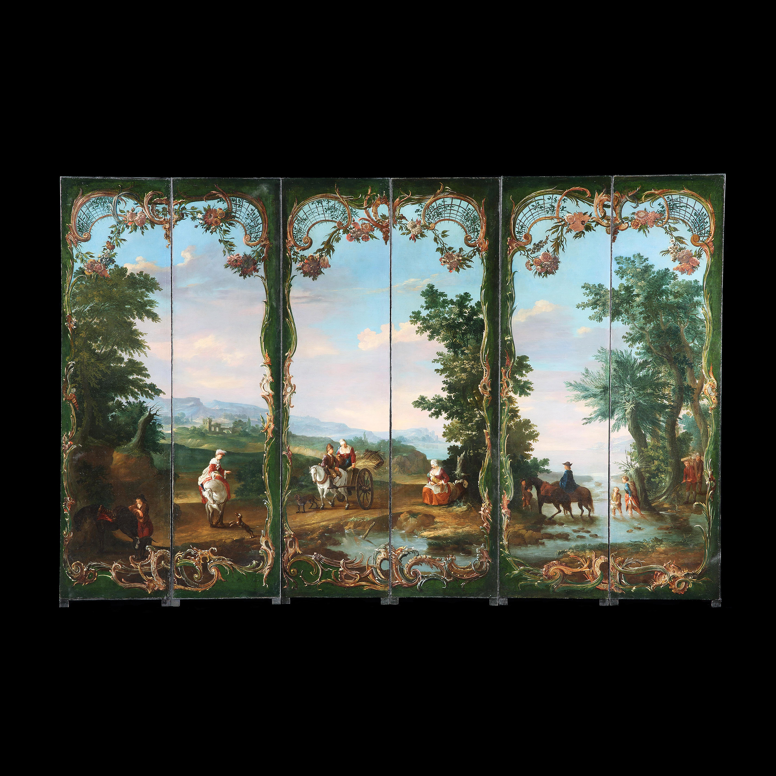 Oil on canvas, depicting a panoramic view of a capriccio north European landscape, perhaps Schlesweig-Holstein, with distant views of the sea, the ruined castles, peasants, and a lady of quality mounted, within a running arched canopy of foliates.