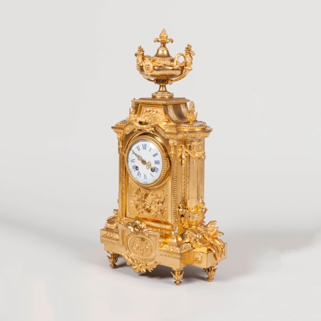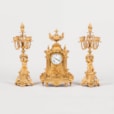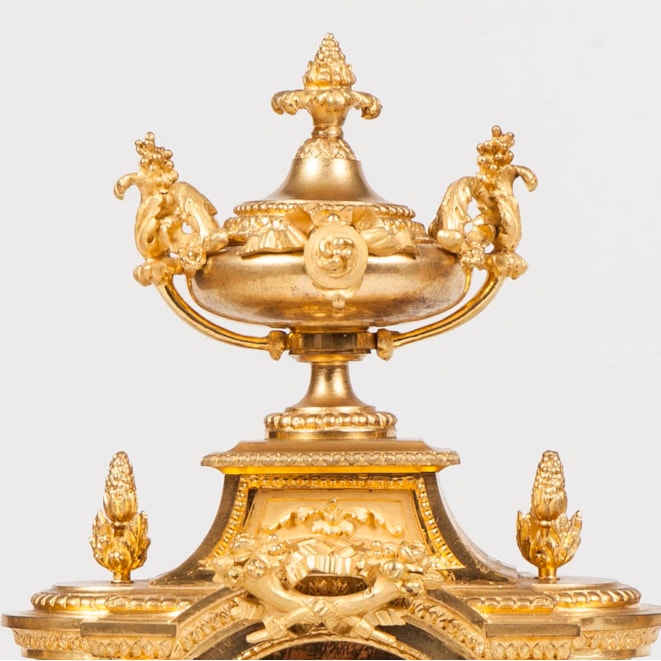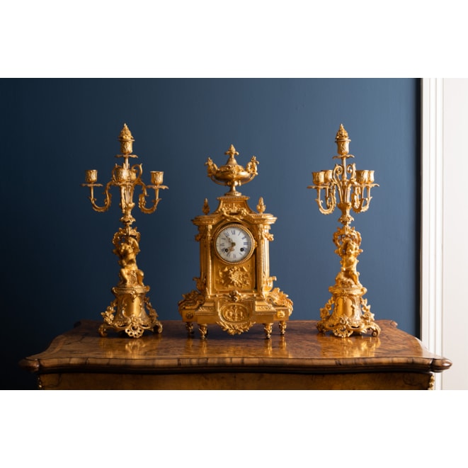 Constructed in two colour ormolu, comprising a richly decorated mantle clock and two candelabra in the late Louis XVI manner; the breakfront form clock rising from foliate adorned toupie feet, having a central panel depicting musical trophies, the enamel dial depicting hours in Roman numerals, and the five minute intervals shown in Arabic numerals; the two train eight day movement strikes the hours on a bell, behind which is the makers mark set in a circle; elongated pine cones flank the sides, and over, a lidded Grecian urn; the side pieces have shaped elliptical bases on which sit putti holding cymbals; over the central column issues four side, and one central candleholder, with a snuffer.