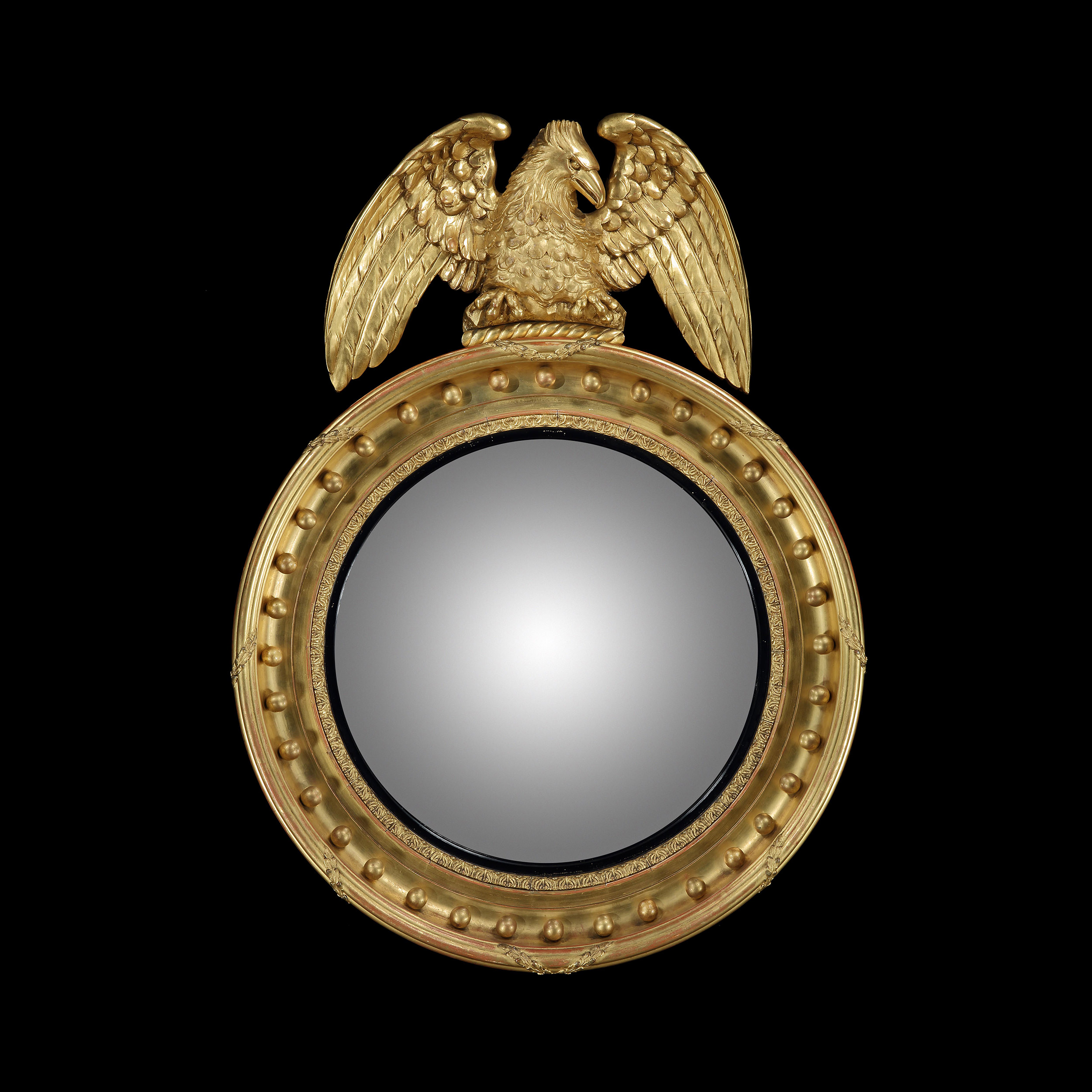 Constructed in giltwood; of circular form, the channelled frame having a 'Running Pearl' pattern to the interior, and the outer frame dressed with oak leaves and a stiff leaf border; surmounted by a well carved eagle, head to dexter, with wings displayed and inverted, as on the reverse of a USA quarter dollar coin.
