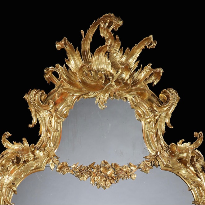 With an elaborately caved framed with free scrolling lappet branches in the rococo style, the base with inverted cabriole legs and a central shell and leaf cartouche, the plate divided by a floral garland and the whole surmounted by an intricate foliate leaf spray.