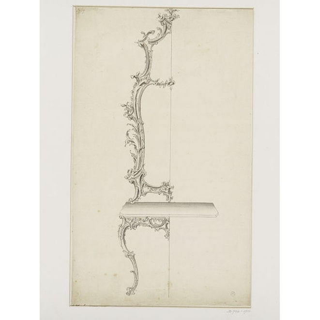 Mirrors of this style were prevalent in the early 1760 to the 1770s or George III style with a number of notable makers producing designs, such as John Linnell, Ince and Mayhew, and Thomas Johnson. This particular mirror closely follows the designs of Thomas Chippendale's drawing of a console table and mirror from approximately 1760 depicted in 'English Furniture Designs of the Eighteenth Century' published by the Victoria and Albert Museum, 1958.