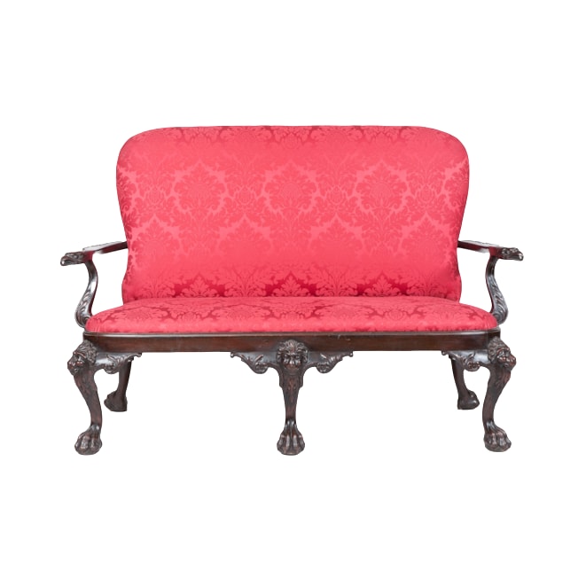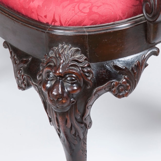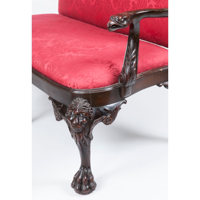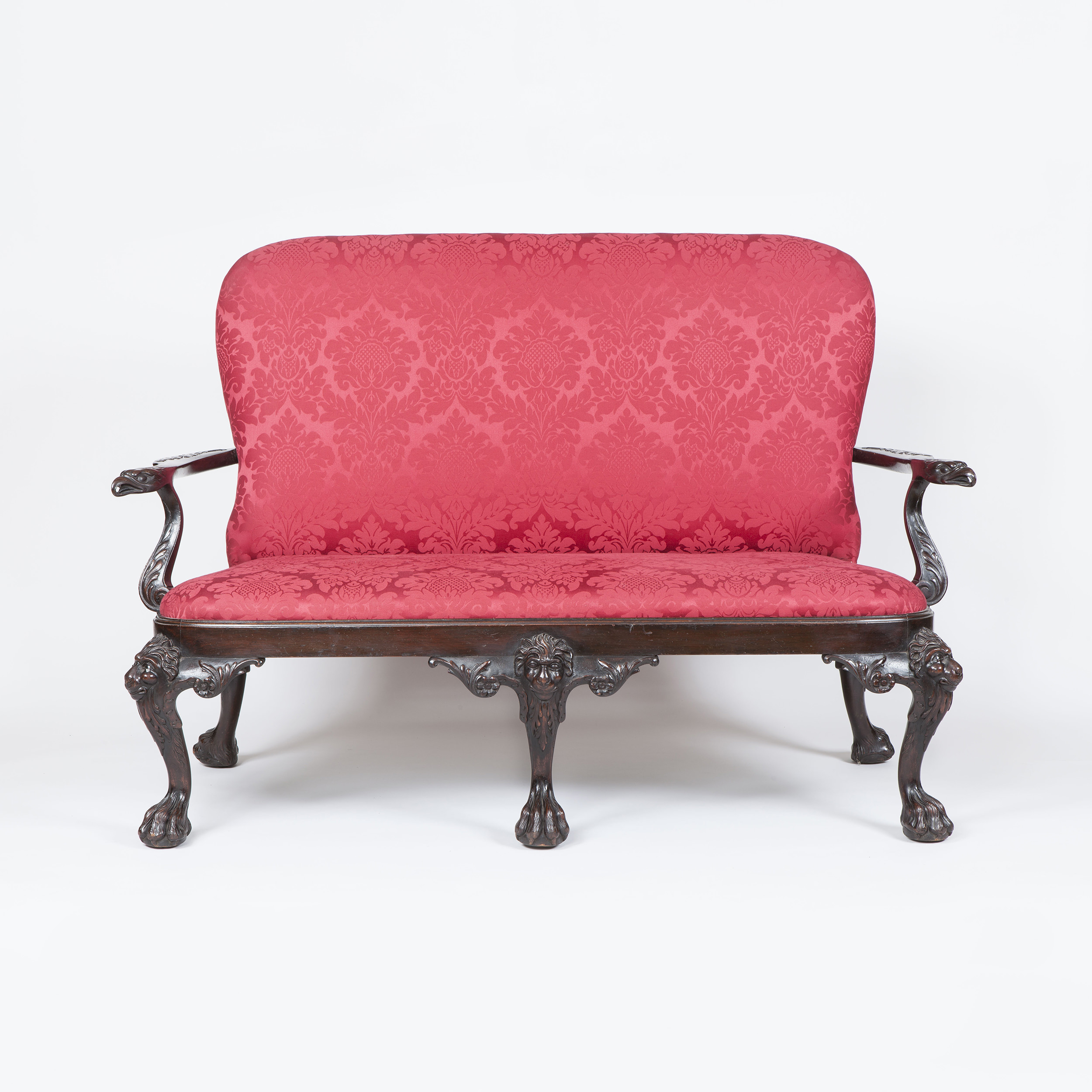 Constructed in red walnut, and reupholstered recently in a patterned damask; rising from cabriole legs with ‘hairy paw’ feet, with lion masks atop: the serpentine front and side rails carved with acanthus foliates; swept foliate carved arms terminate in eagle heads, conjoining the drop in seat with the shaped back.