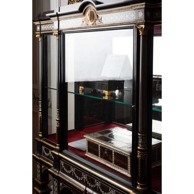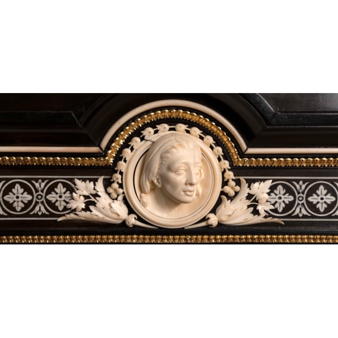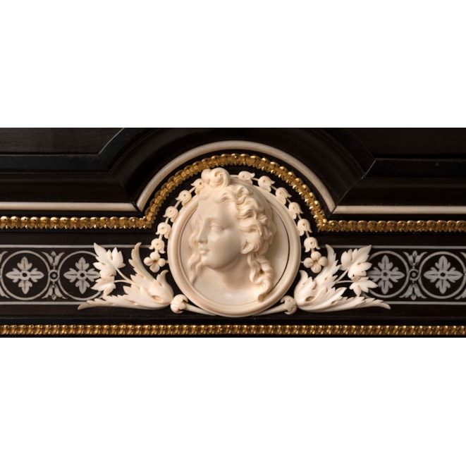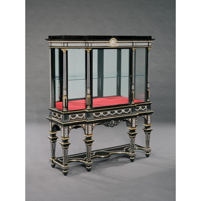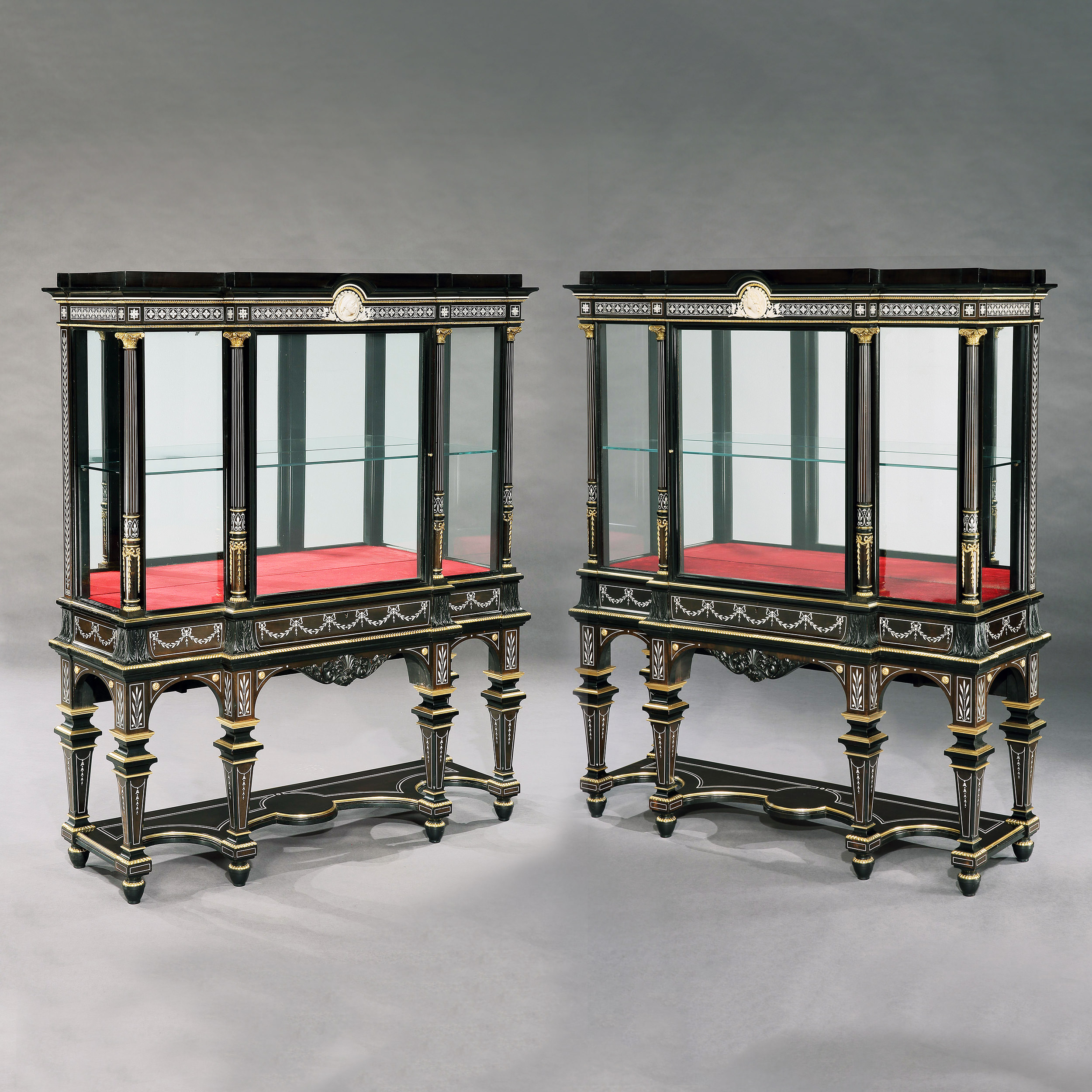 Constructed in ebony, with extensive highly detailed ivory inlays and finely cast and chased bronze and brass dressings. Of rectangular gentle breakfront form, each rising from four inverted tapering square section collared legs, having conjoining incurved undertiers; over, shaped aprons, inlaid with foliate festoons frame the glazed vitrines, having central lockable doors, the locks being marked 'IMPd Patent Lever', are housed within vertically inlaid Corinthian capped columns; the stepped platforms conformingly inlaid. The fascia panels over have centrally situated carved busts of a male and female in the neo-renaissance manner.