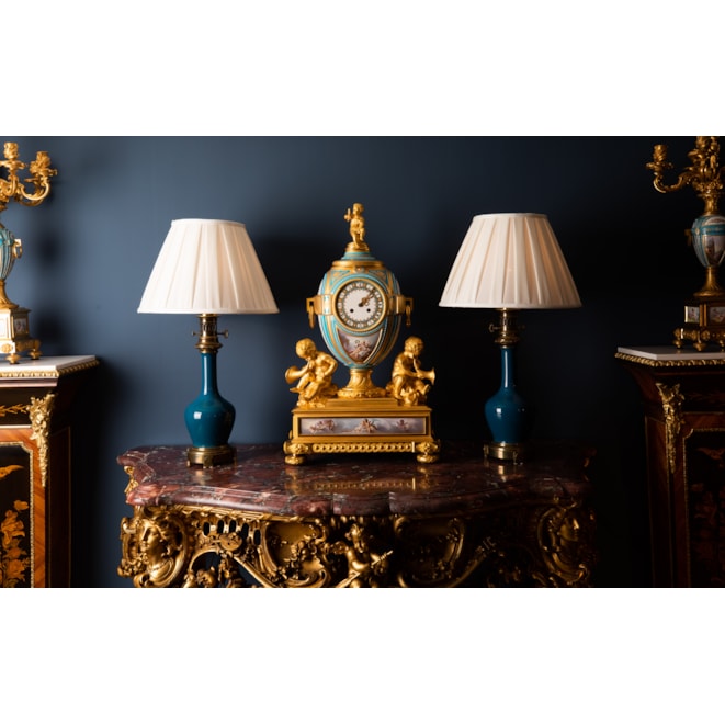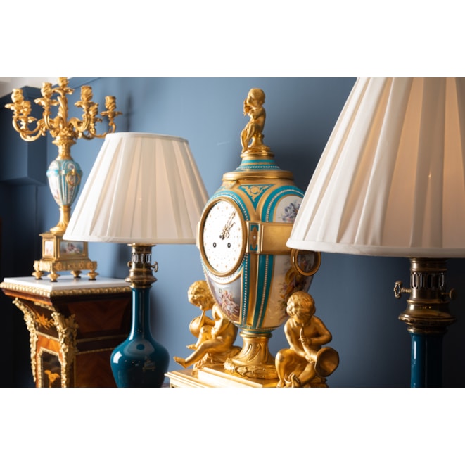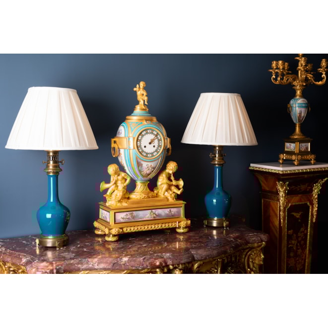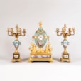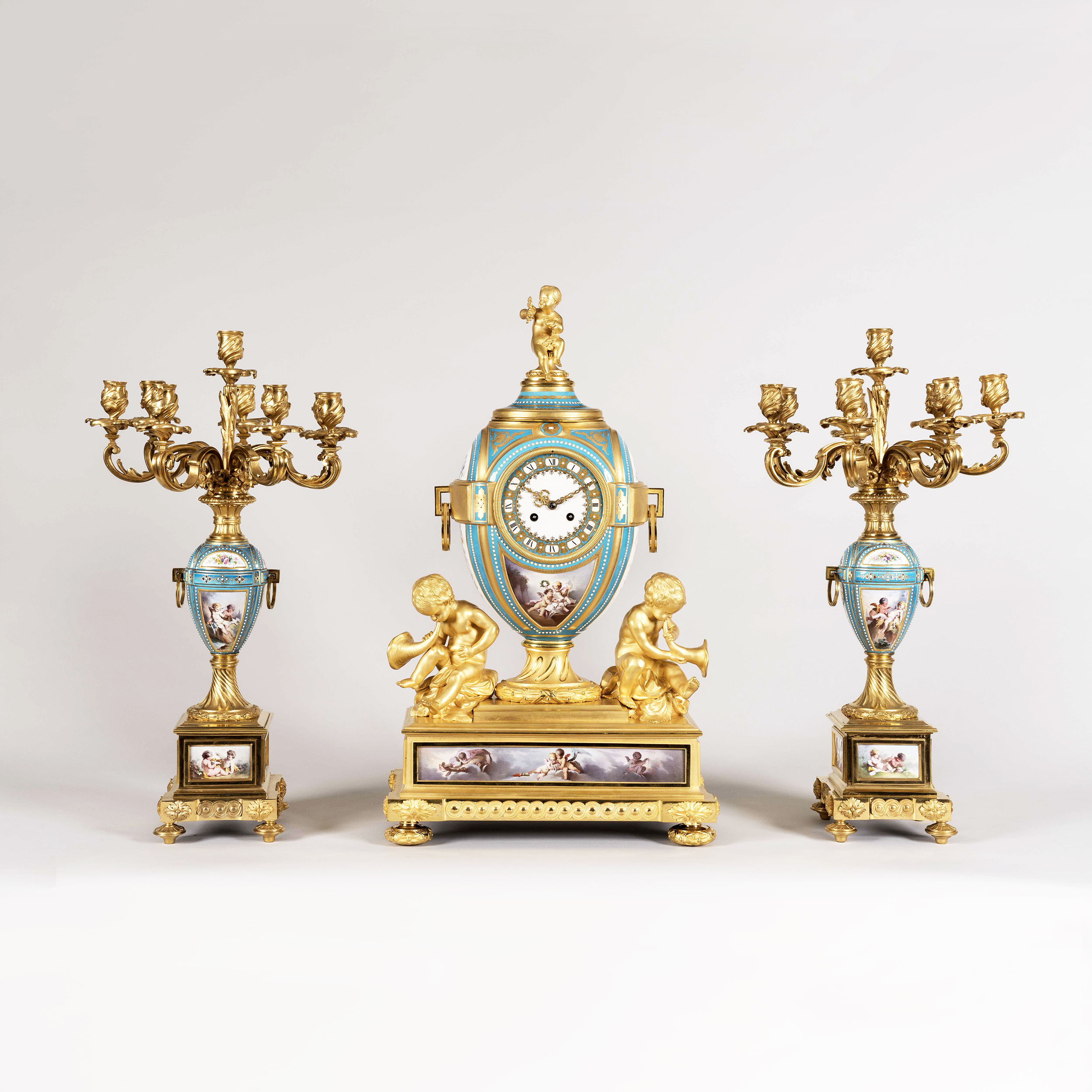 Constructed in well cast and chased gilt bronze, with 'Sevres' type 'jewelled' gilded porcelain with a Bleu Céleste field, hand painted with polychromes, and comprising a mantle clock of important size, and a pair of eight light candelabra, all in the Louis XVI manner.