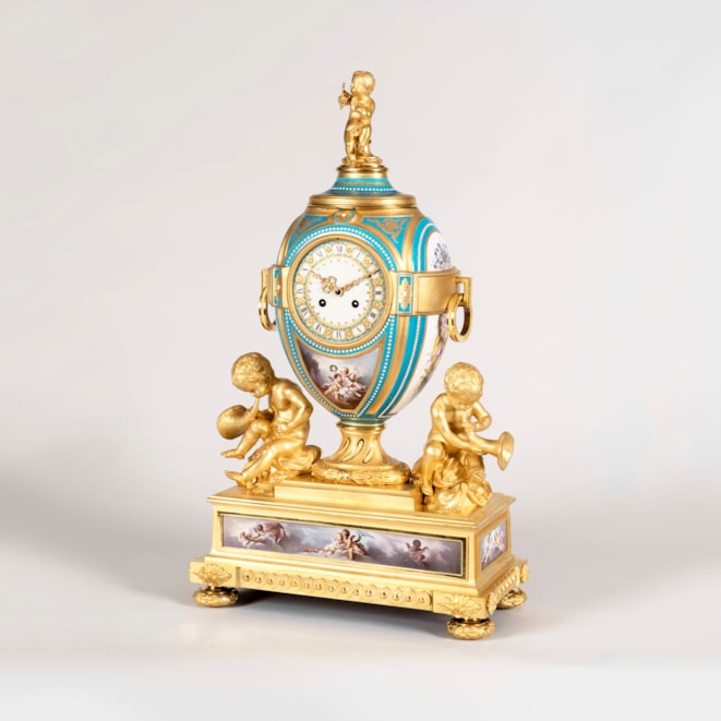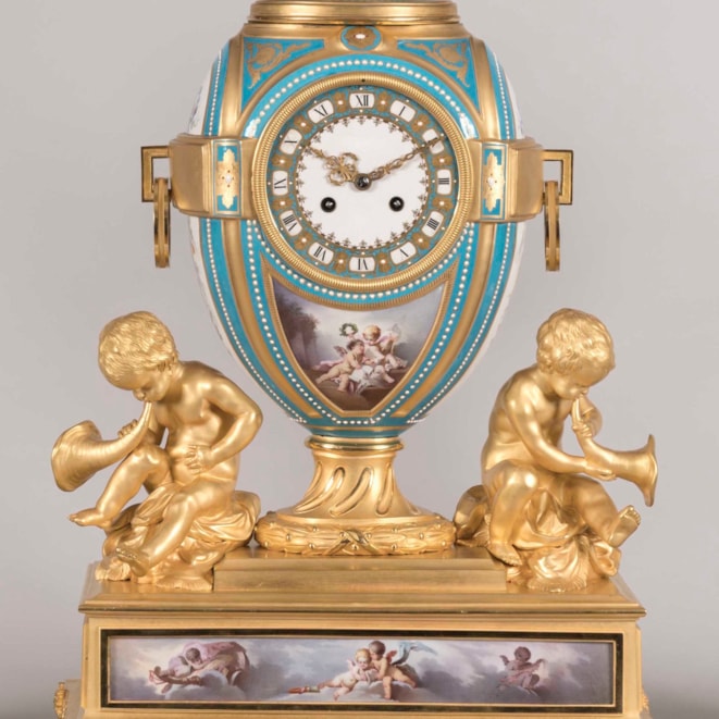 Rising from laurel wreathed oblate bun feet, the inverted breakfront plinth base has a running boss pattern, with paterae at the intersterces, and rectangular plaques with mythological subjects; over, putti with horns flank the Montgolfier form, gilt bronze girt urn, cast as strapwork, set on an elliptical gilt bronze torsade plinth, housing the circular enamel clock face, with the hours delineated in Roman numerals, and gilt hands. Surmounted by a putto finial on the dome cap. The twin train clock eight day movement strikes on a bell. The matching candelabra side pieces each have seven lights set about a central taller light.