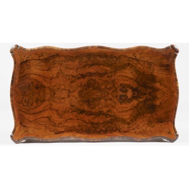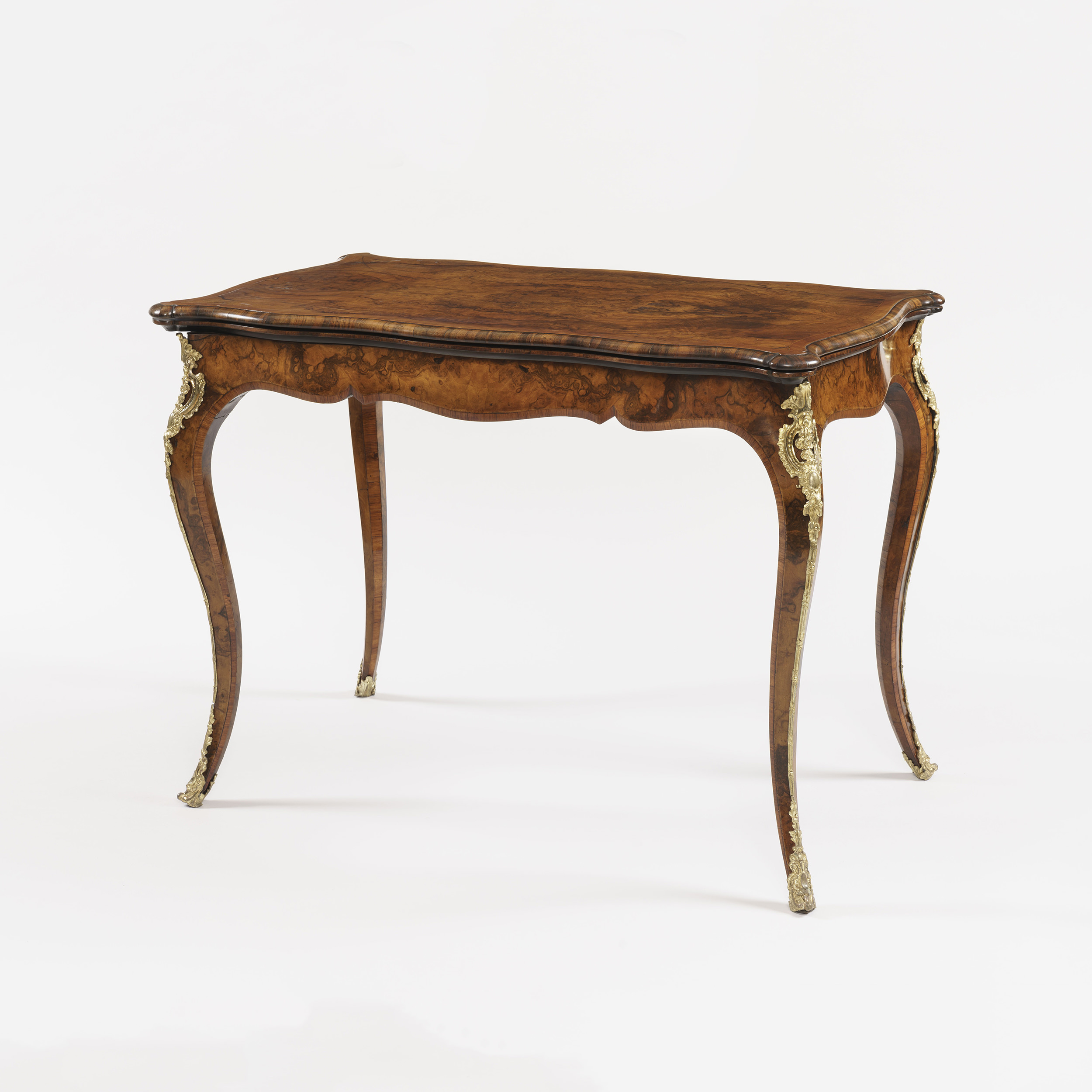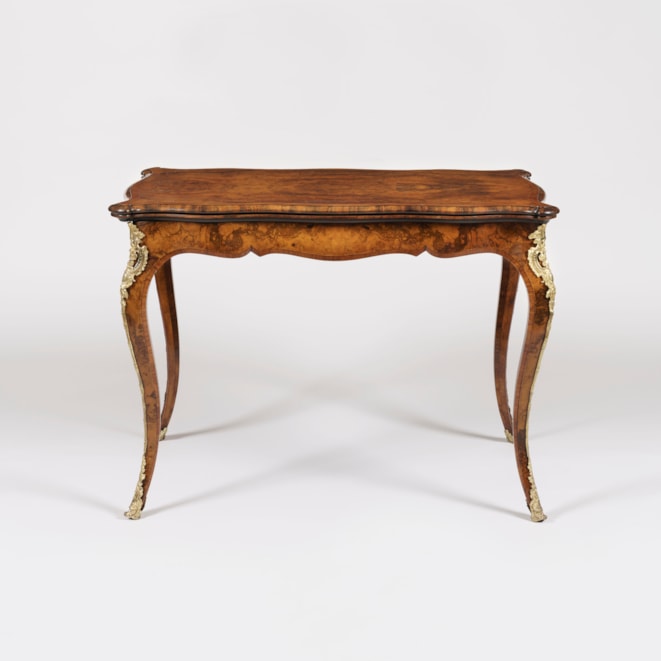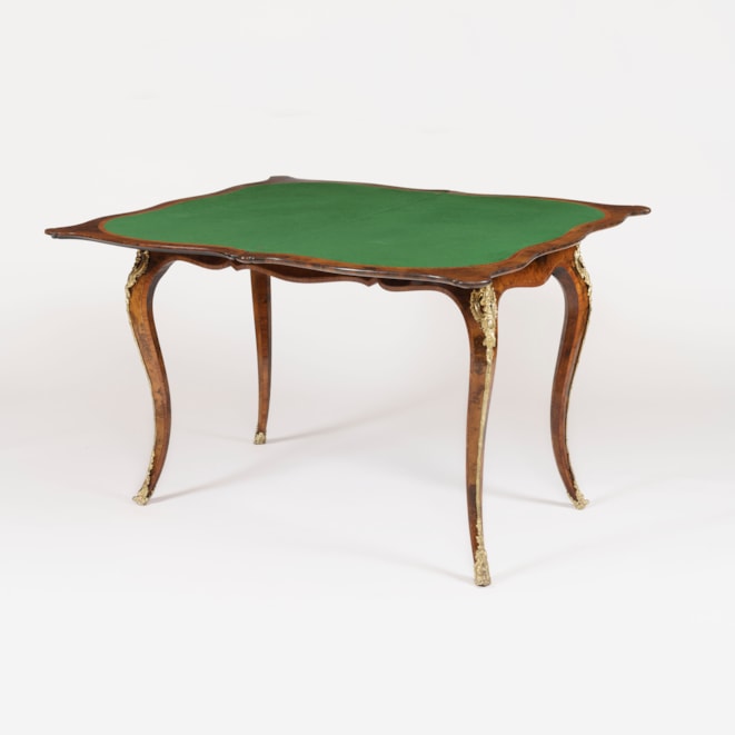 Constructed using finely figured Circassian walnut, dressed with gilt bronze mounts; rising from slender kingwood banded cabriole legs shod with bronze sabots and espagnolettes. The shaped serpentine folding swivel top opens to reveal a green baize playing surface.