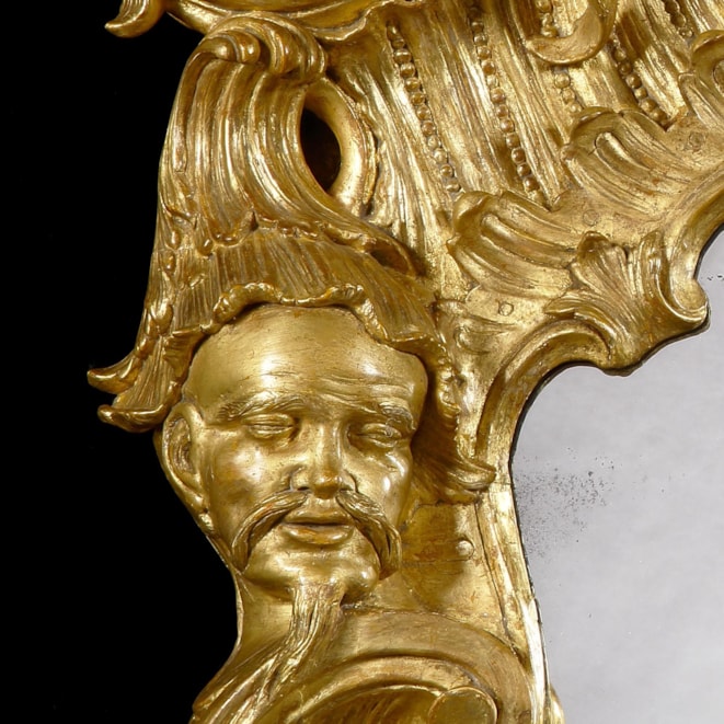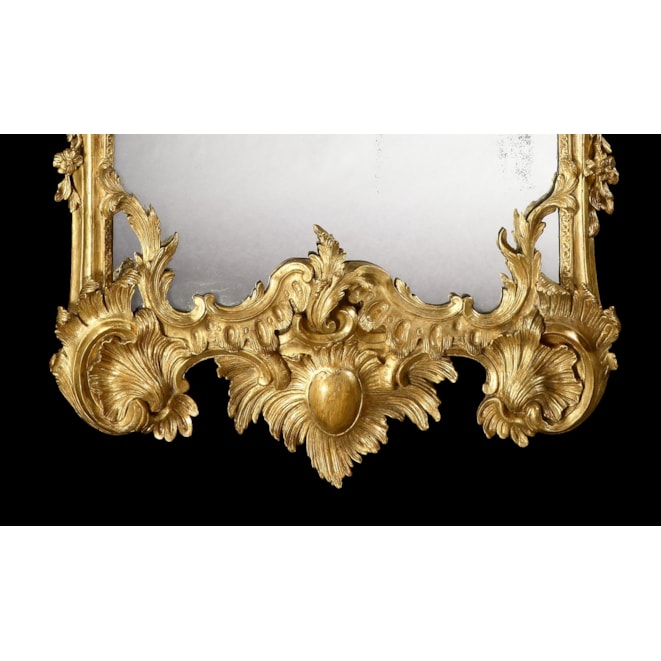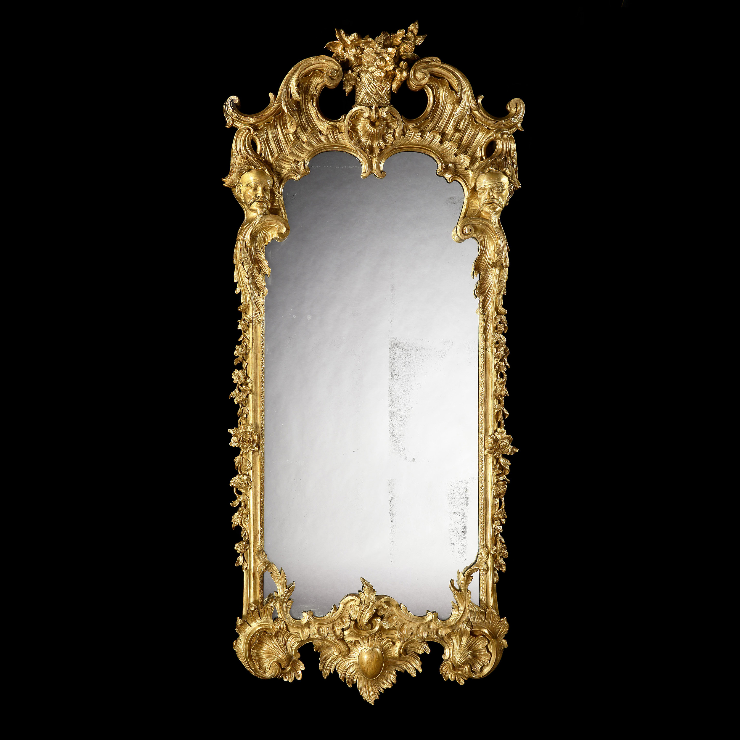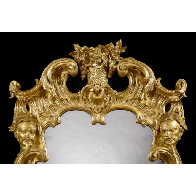 Of rectangular form, constructed in giltwood and gesso, elaborately carved incorporating filigree inner-moulding and floriate branches to the sides; above, a flower basket at the apex is flanked by a twin-scroll pediment supported by a carved balustrade, a central stylised shell, and a pendant pair of oriental masks; and below, a large scallop shell, emblematic of birth and unity, the whole enclosing a mercury glass plate.