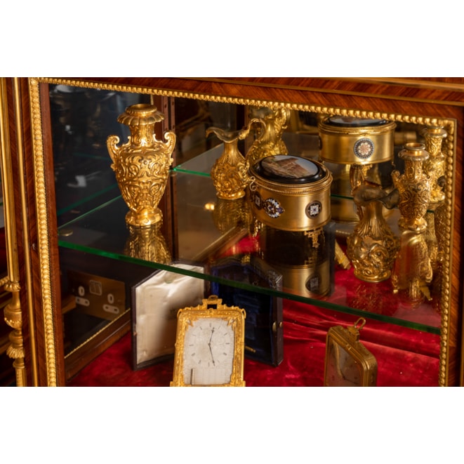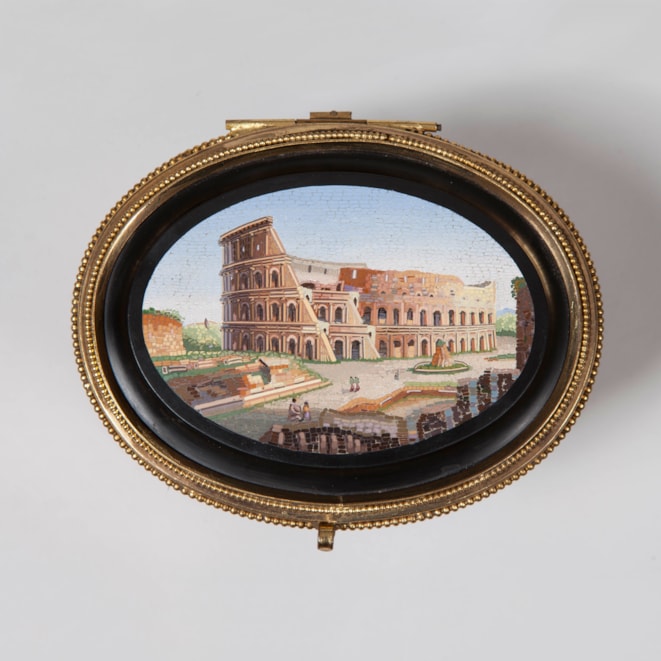 Of elliptical form, constructed in gilt bronze, rising from swept feet, the body dressed with stylised floral enamelled plaques, the hinged, rising top having a fine micro-mosaic of the Colosseum, with figures to the foreground; the red quilted interior having the maker's name in gilt, 'C. Rocchegianni Roma'.