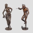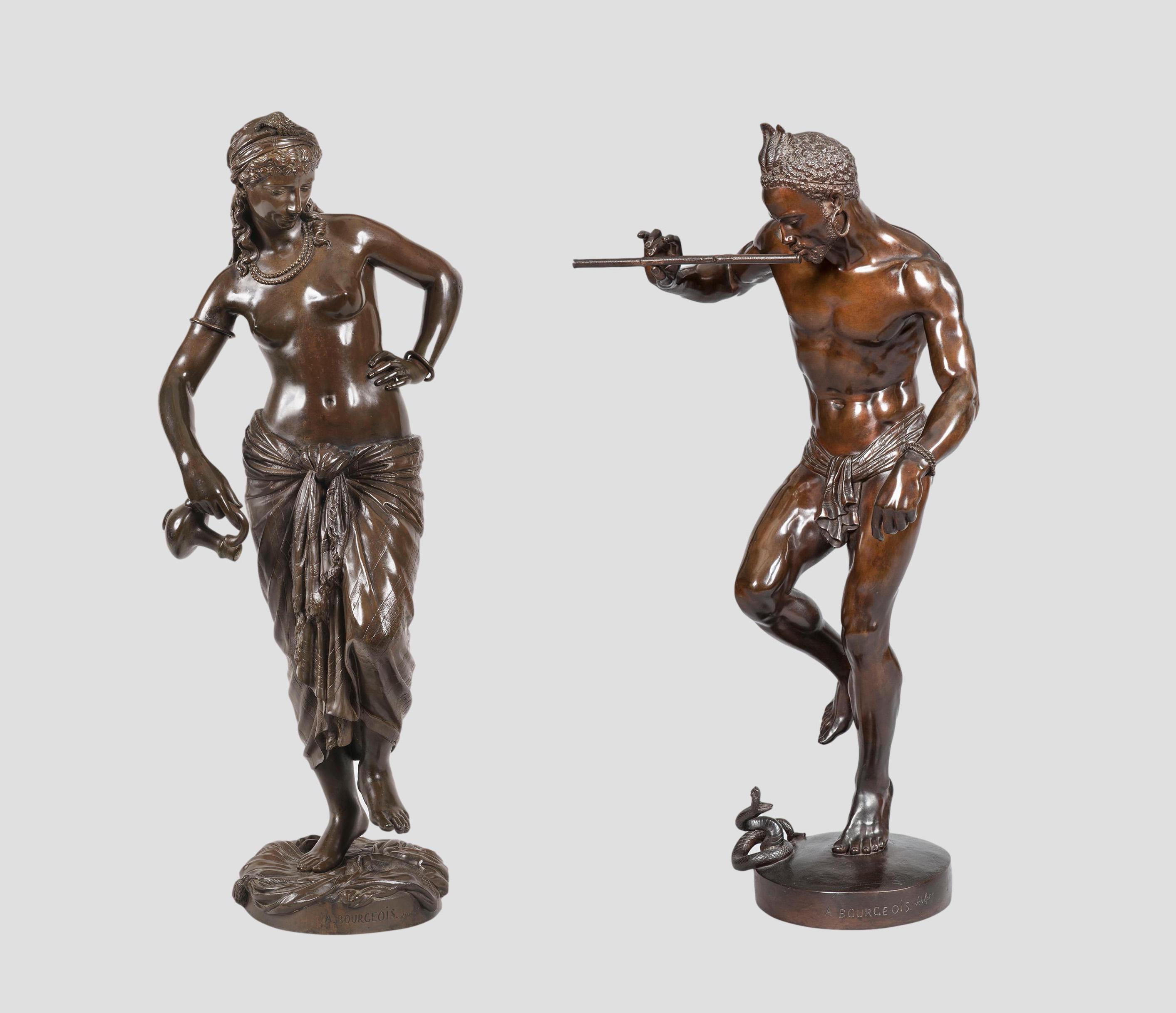 A figural pair, both in cast bronze, now well patinated, the female figure rising from a circular base, cast with drapery, portraying an orientalist concubine wearing a loose skirt, her pendant pair is the famous snake charmer, also on a circular base, cast with a coiled snake, the loincloth-draped figure playing his woodwind instrument. Both inscribed with the artist's name "A. Bourgeois."