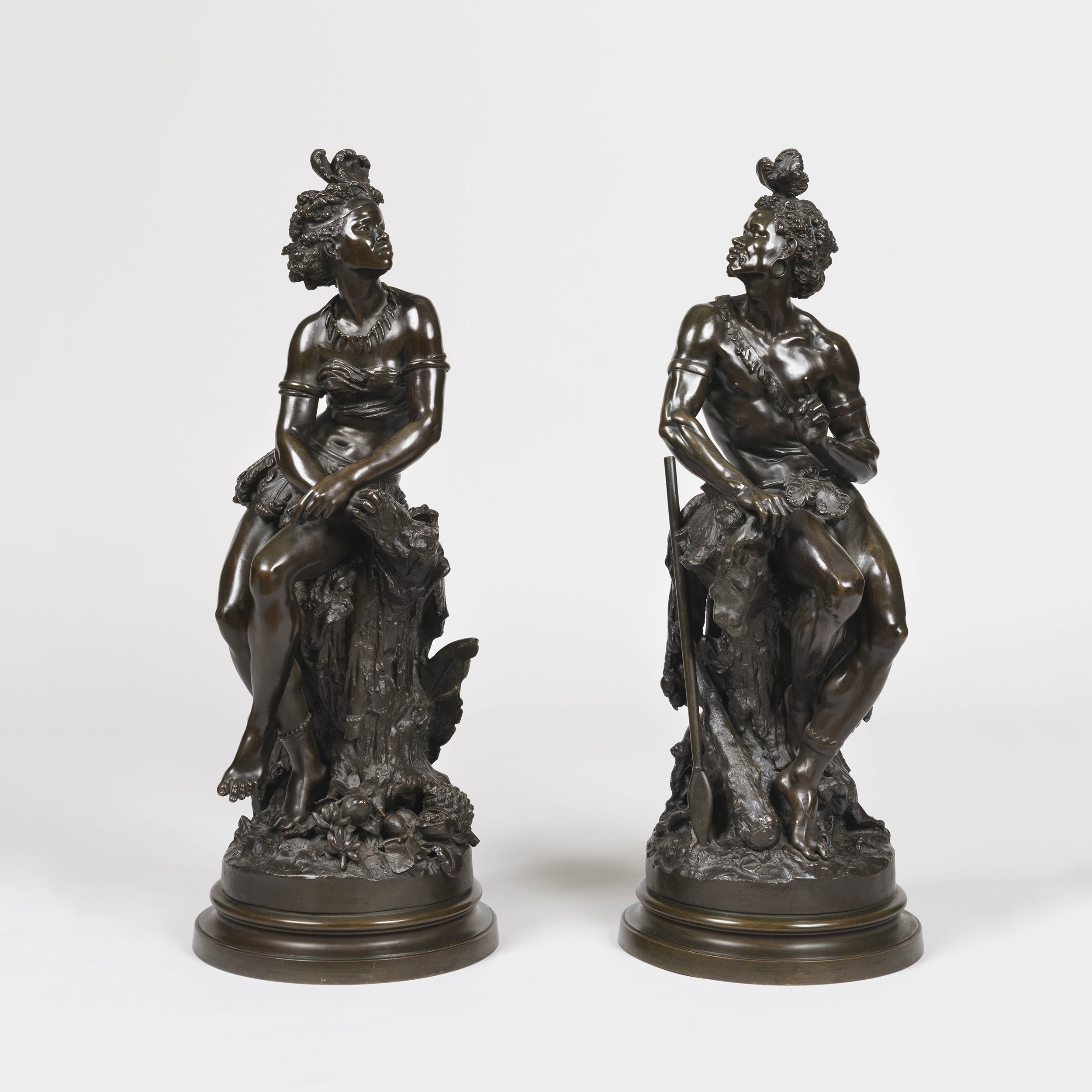 Modelled in a now well patinated bronze, the circular bases, inscribed with the artist's name, support tree trunks, against which rest the young warrior holding his spear, and his partner, a draped young woman with a necklace of animal teeth.