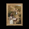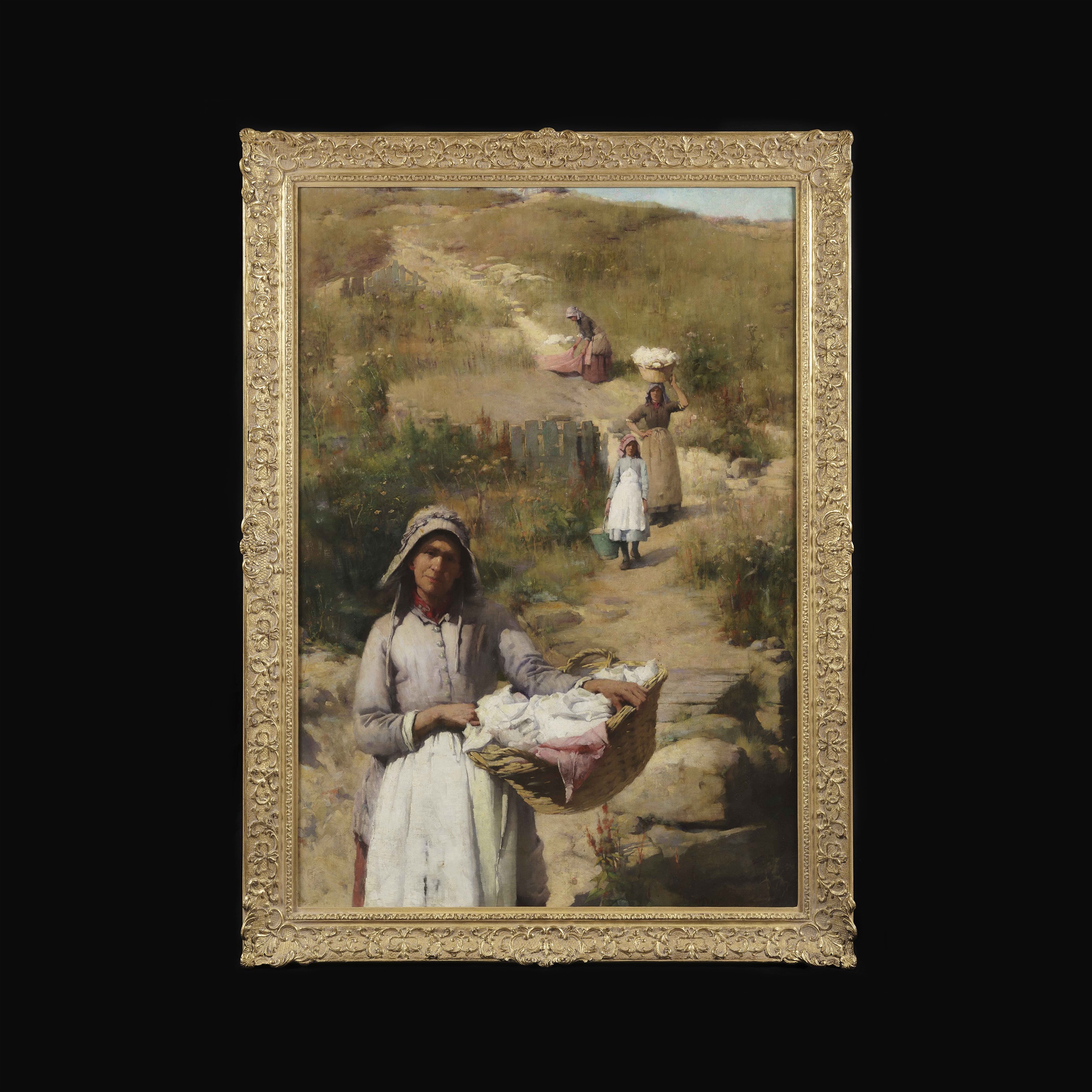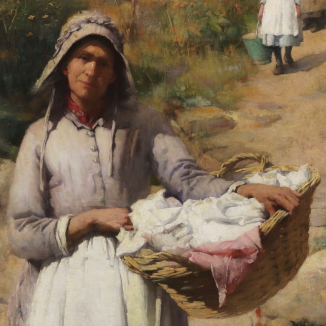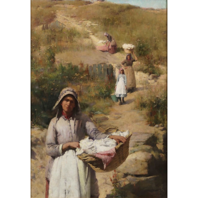 A student of Sir Edward Poynter, (whom he later succeeded as the President of the Royal Academy), and later, in France, under the direction of Jules Joseph Lefebvre, (member of the Legion d’honneur, and a leading light in the Academie des Beaux-Arts, and painting professor at the Academie Julian); Sir Samuel Llewellyn worked in the broad brush plein air manner in the French countryside, especially in Brittany, with the women (Les Lavandieres) depicted being shown in regional Breton costumes.